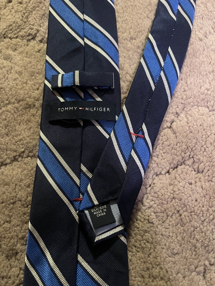 This is a Tommy Hilfiger men's tie made of blue silk with a striped pattern. The tie has a classic width of 3 1/8 inches and features a blue on blue color scheme.