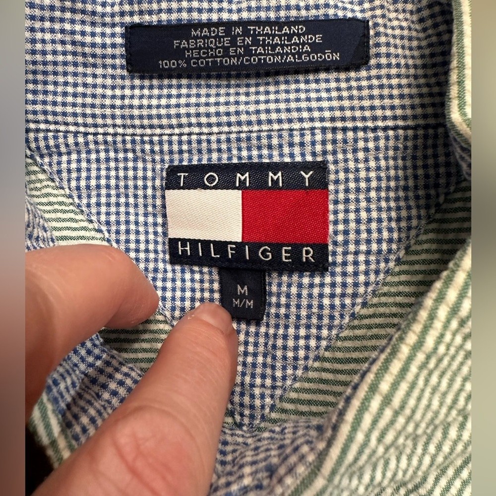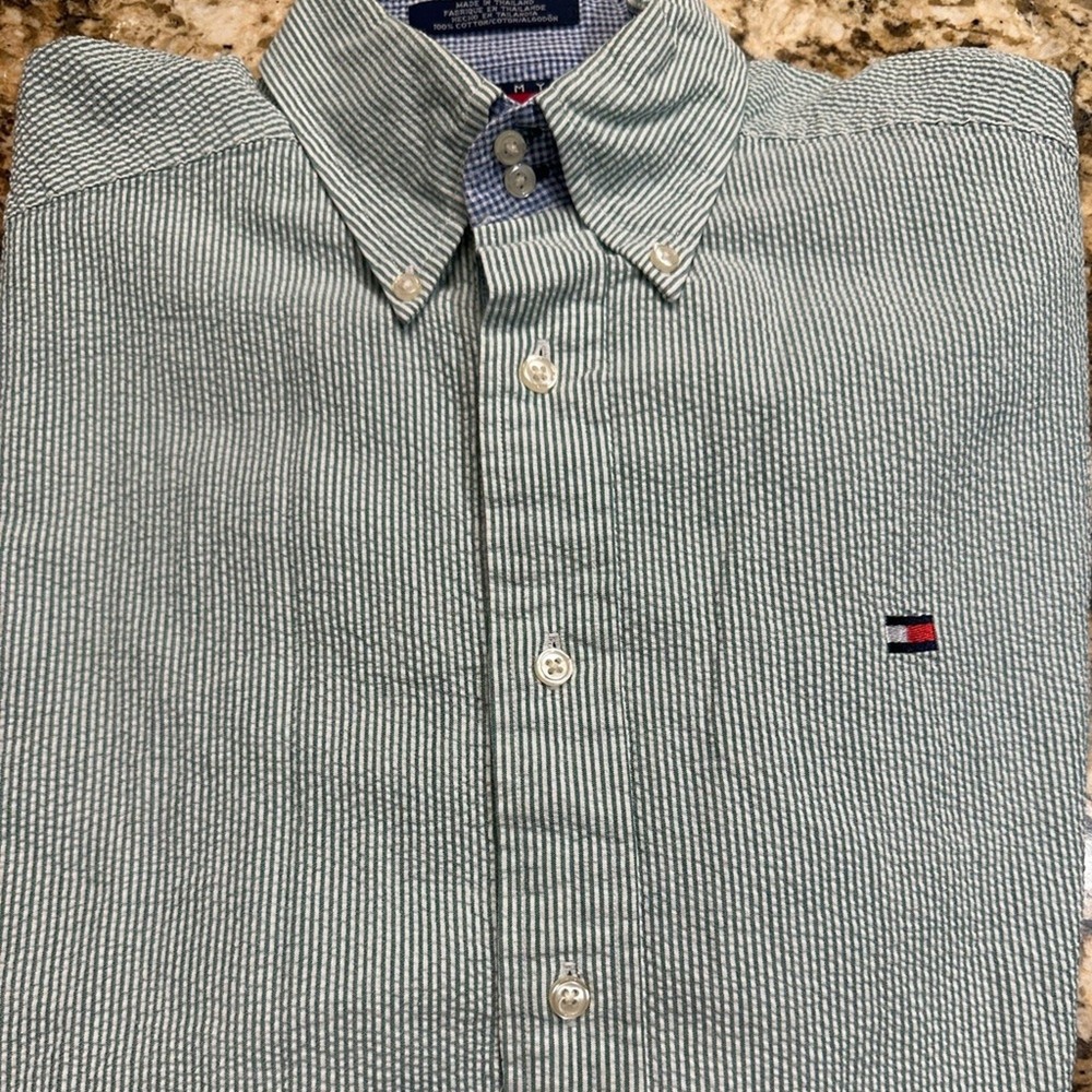 This shirt is a total winner! The seersucker fabric feels lightweight and breathable, perfect for warm days. The green and white stripes give it a crisp, classic look that pairs well with anything. Fits true to size and the quality is just what you'd expect from Tommy Hilfiger. Barely shows any wear—such a great find!