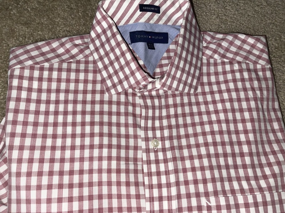Mens Tommy Hilfiger Long Sleeve Plaid Button Up Shirt Size 15 1/2 32-33 All cotton Regular fit Great looking maroon and white multi plaid long sleeve button front shirt Pocket Cuffs can be flipped to diagonal striped pattern - see pictures Tommy "bar flag" logo above cuff buttons Excellent used condition VERY NICE SHIRT FROM SMOKE FREE HOME! FAST SHIPPING WITH TRACKING INFORMATION PROVIDED.