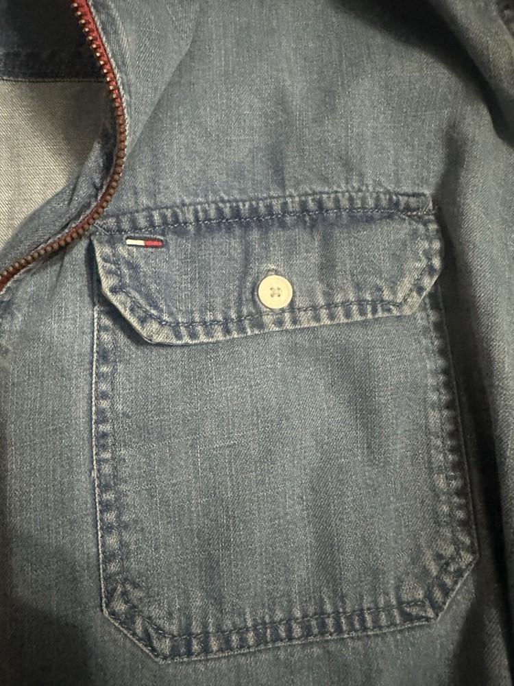Tommy Hilfiger Denim Jacket Mens medium Blue Relaxed Full Zip Spellout Y2K Logo. Condition is Pre-owned. Shipped with USPS Ground Advantage.
