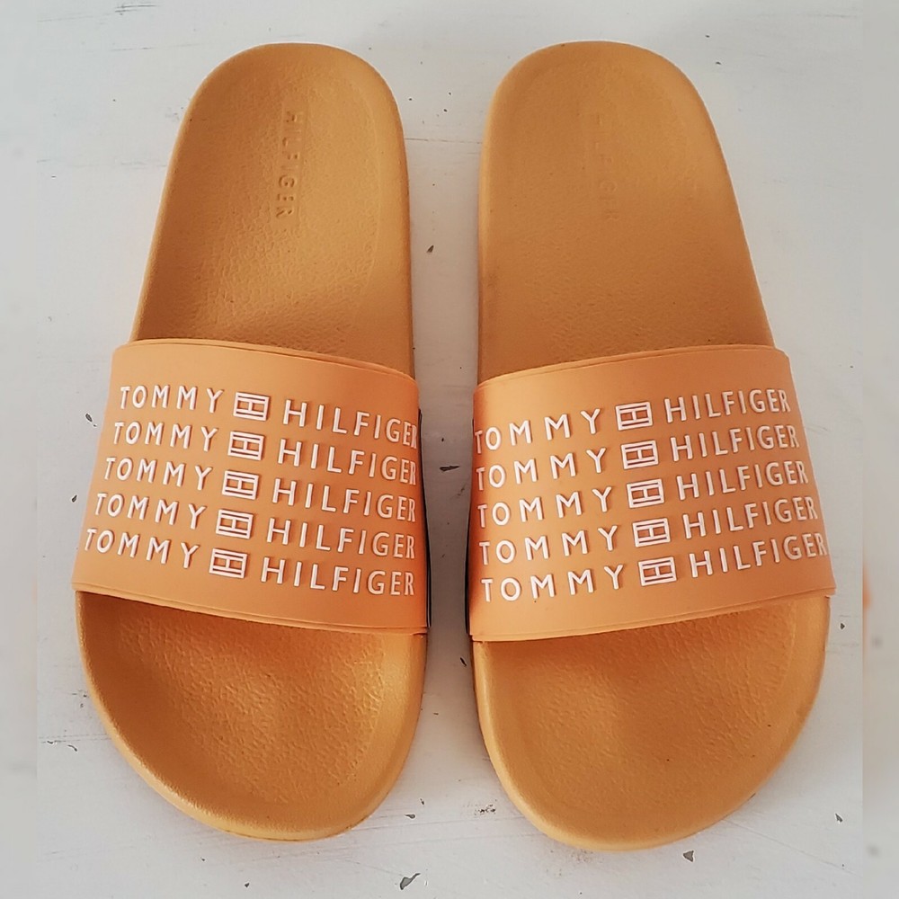 TOMMY HILFIGER AUTHENTIC ESCO-C SLIDE SANDALS MEN'S ORANGE HIGH RELIEF LOGO AND the iconic tommy flag on the sides SIZE 11 LIGHTWEIGHT.CONDITION NEW WITH TAGS.