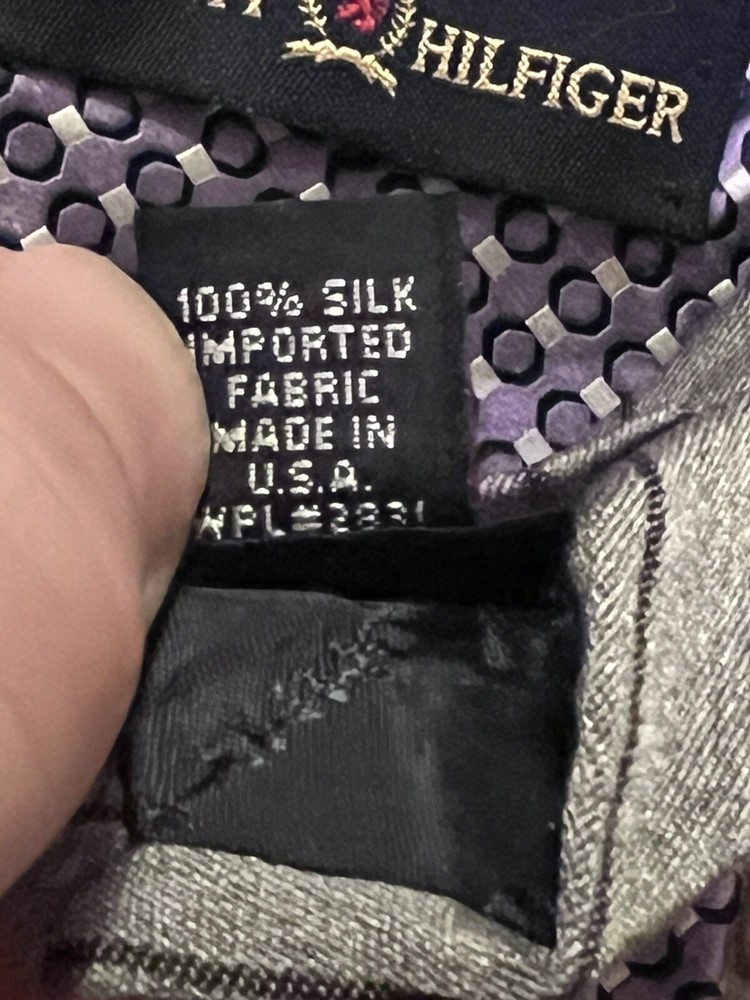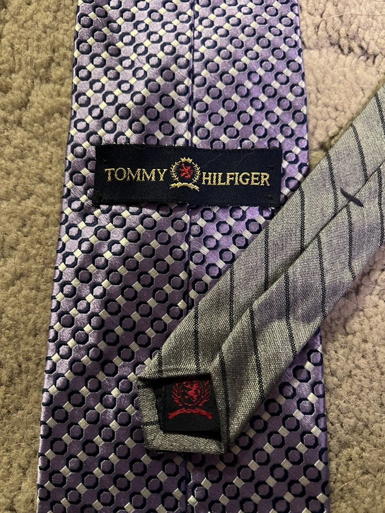 This is a designer Tommy Hilfiger men's tie in purple color, made of silk in Italy. It is a high-quality accessory suitable for formal occasions.