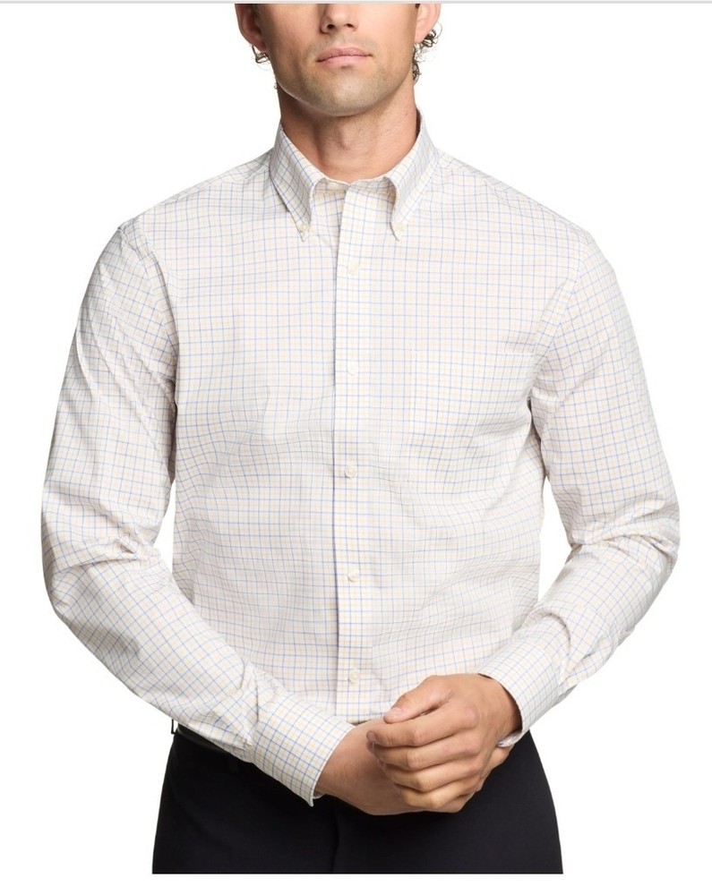 The product is a Tommy Hilfiger Men's Regular fit Dress Shirt in size XL, featuring a yellow plaid pattern. It has a collared neckline, button closure, and is made from a cotton blend fabric wash. The sleeve length is 36-37 inches, and the top cuff style is a barrel cuff. This dress shirt is designed for a regular fit and has a neck size of 17.5 inches. Perfect for men looking for a stylish and comfortable dress shirt for various occasions.
