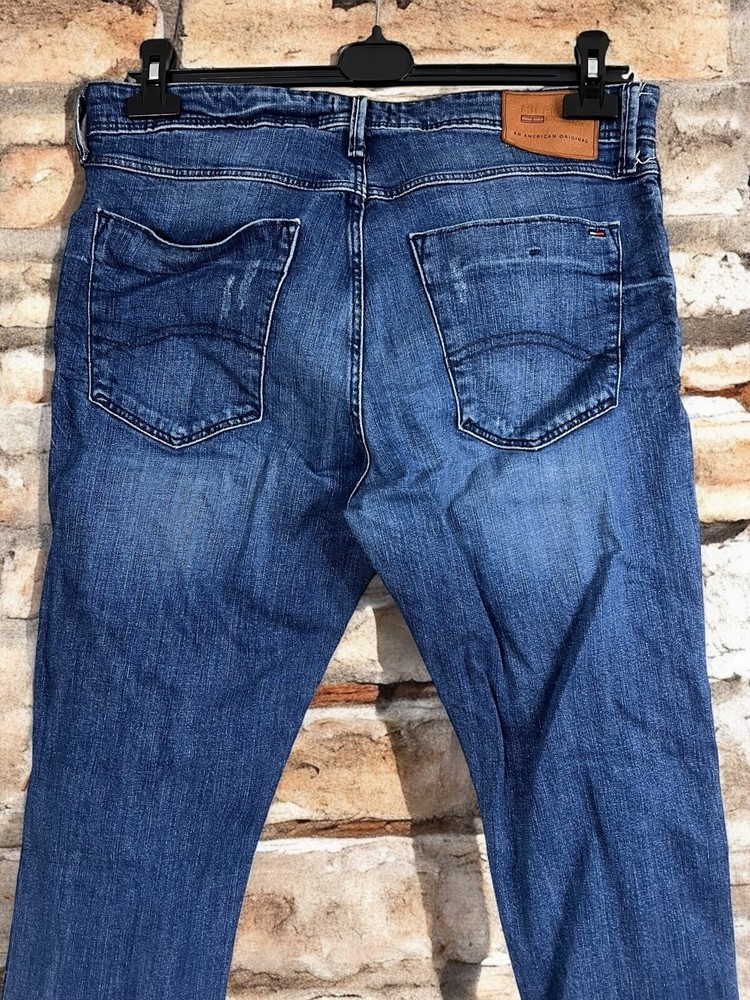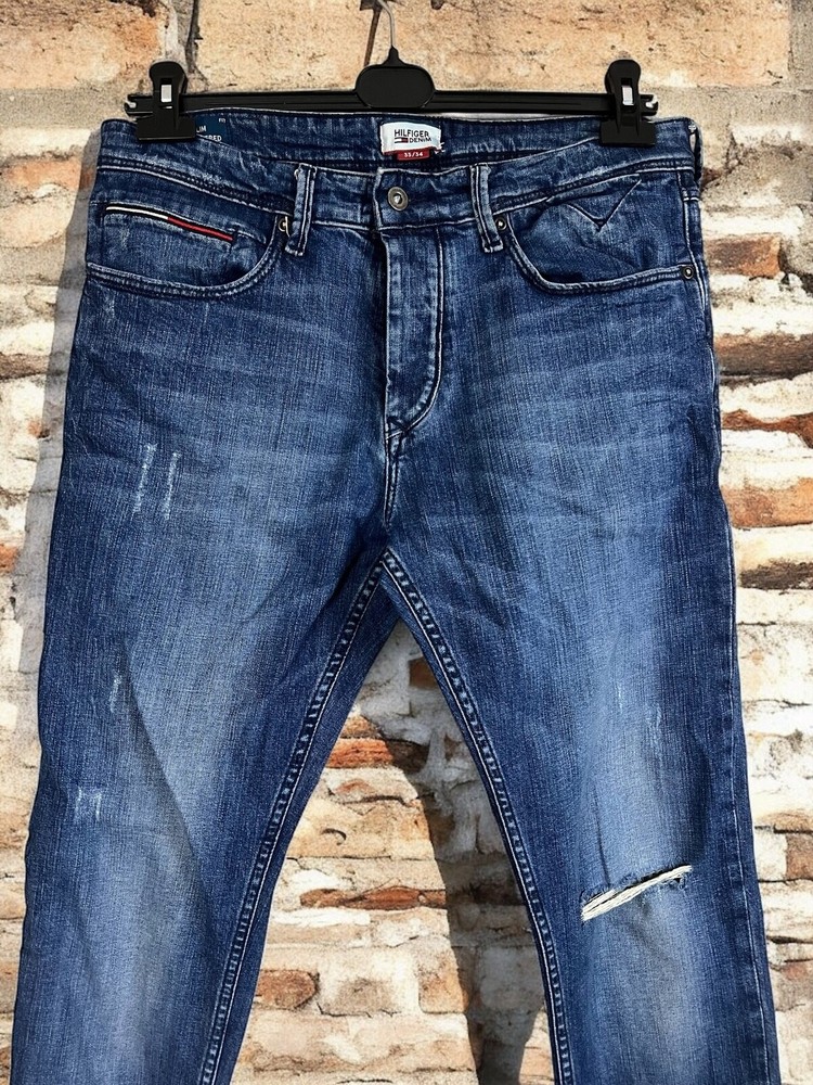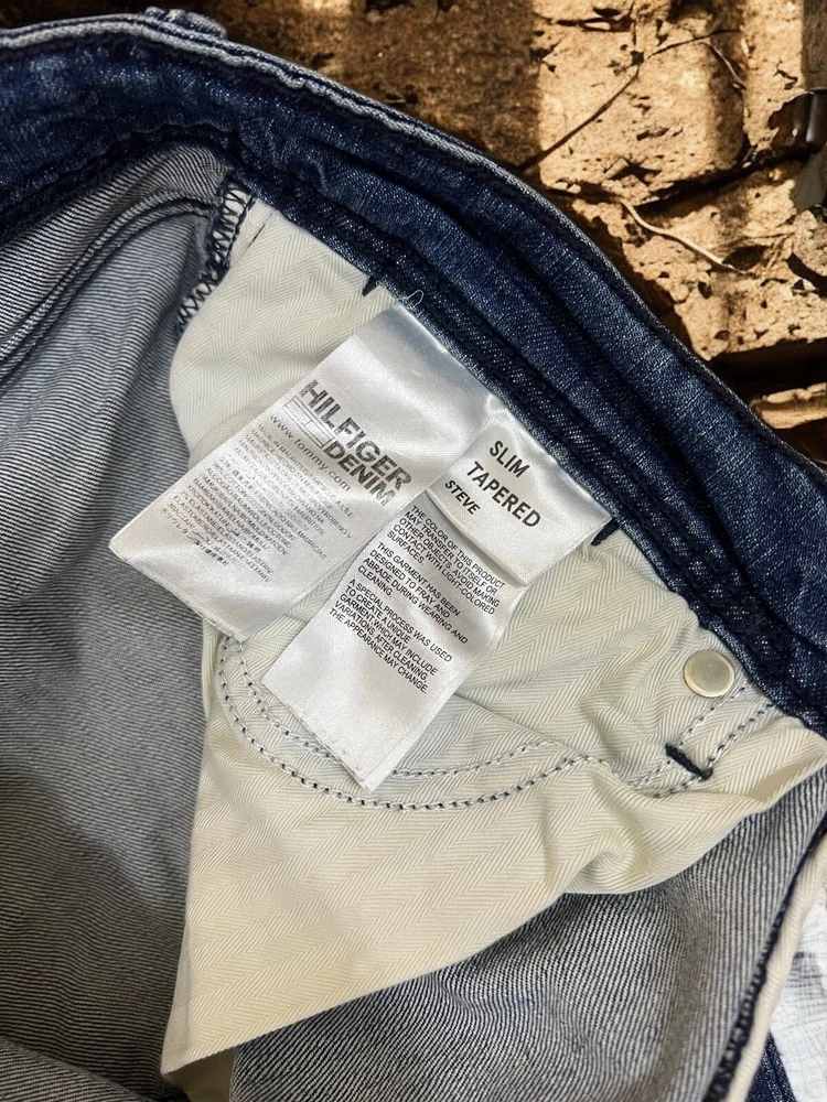 Embrace timeless style with the Tommy Hilfiger Men's Steve Jeans, tailored for a slim fit that moves with you. These jeans feature a classic button closure, a comfortable mid-rise, and a versatile medium wash denim that transitions effortlessly from casual to smart-casual settings. The size 33 waist and 34 inseam ensure a flattering fit for a variety of body types, while the cotton blend material offers both durability and breathability. Attention to detail is evident with the jeans' five-pocket design, providing practicality without sacrificing style. The signature Tommy Hilfiger logo accentuates the tapered leg, giving a subtle nod to the brand's iconic aesthetic. Machine washable for easy care, these jeans are a staple for any wardrobe, ready to be paired with your favorite shirts and shoes for an effortlessly put-together look. Measurements: Waist: 43,5 cm length: 108 cm Inseam: 84 cm Leg opening: 16 cm Front rise: 28 cm Back rise: 39 cm Feel free to make me any reasonable price offers.