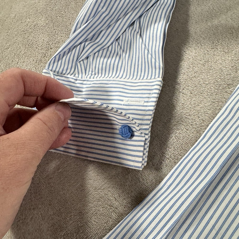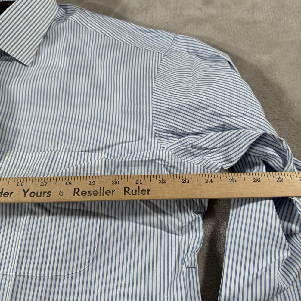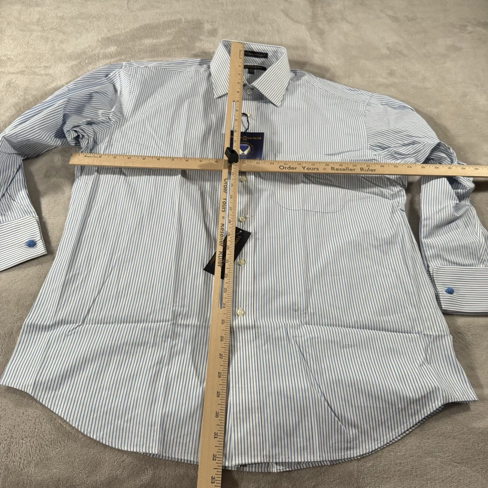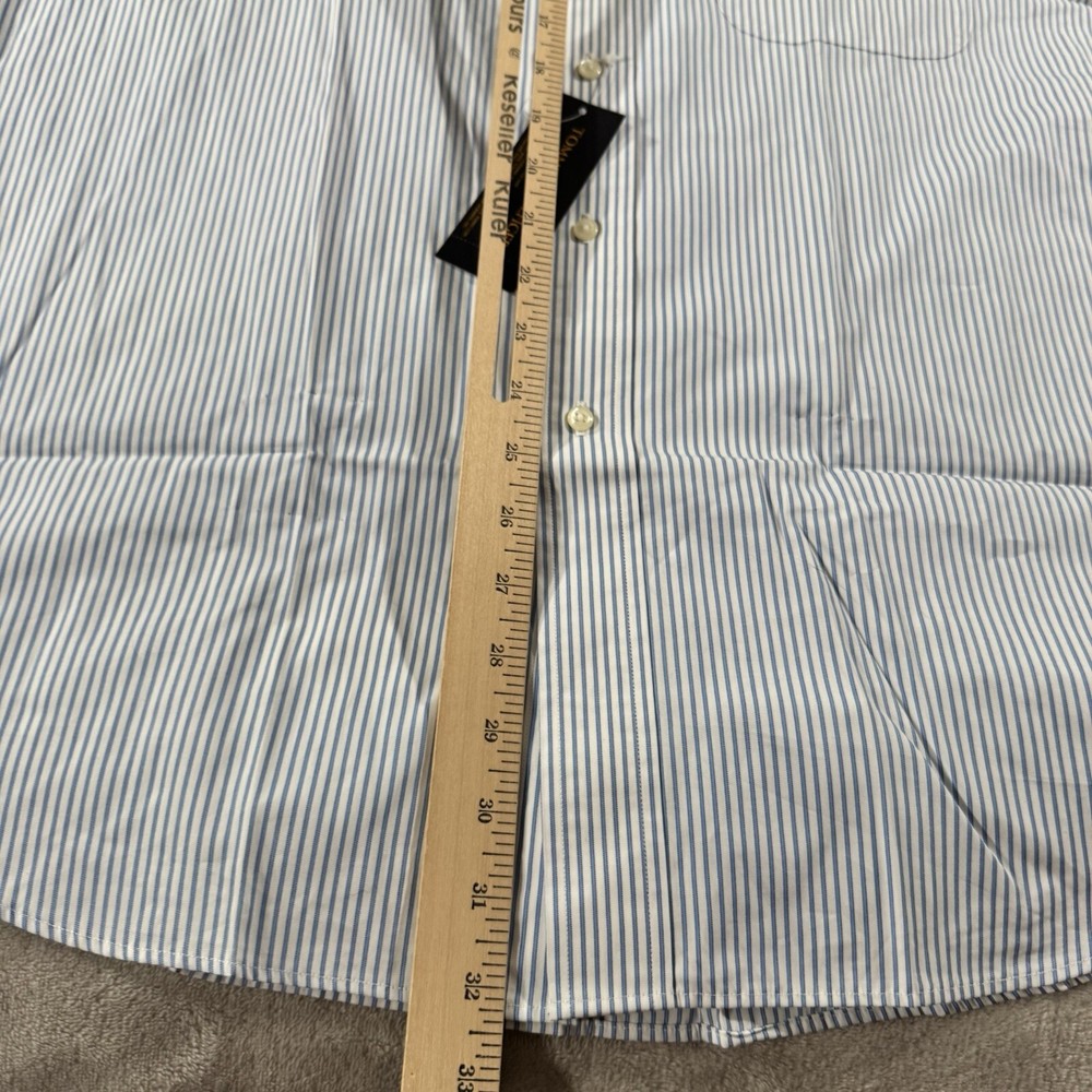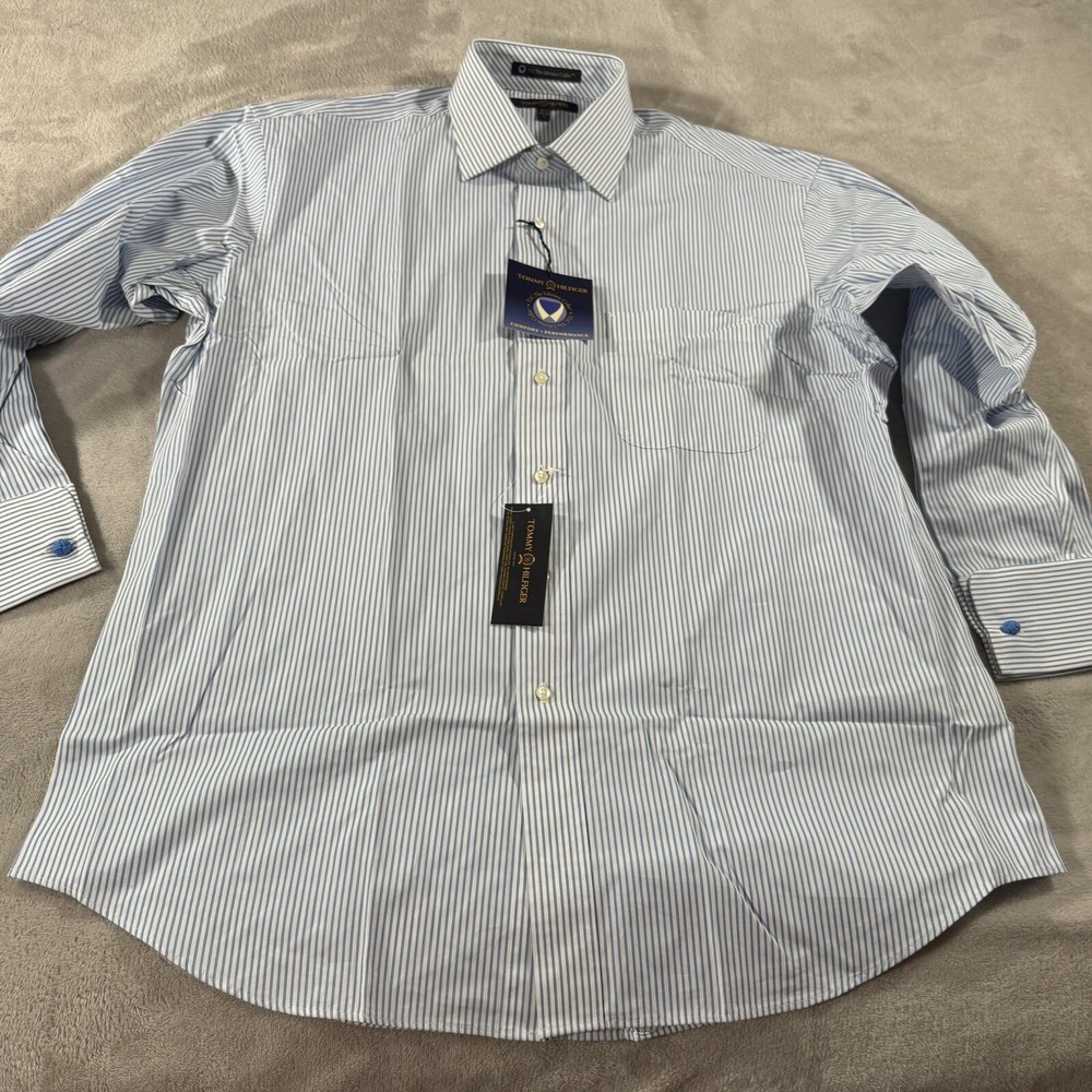 Look effortlessly stylish with this Tommy Hilfiger men's dress shirt. Featuring a classic spread collar and button closure, this woven blue and white striped shirt is made of 100% cotton, making it comfortable to wear and machine washable for easy care. The contrasting trim and all-season features make it a versatile addition to any wardrobe, suitable for various occasions such as travel, weddings, parties, christenings, formal events, workwear, and business meetings. This vintage shirt has a regular fit and comes in size large with a neck size of 16.5 and a chest size that can be seen in the photos provided.
