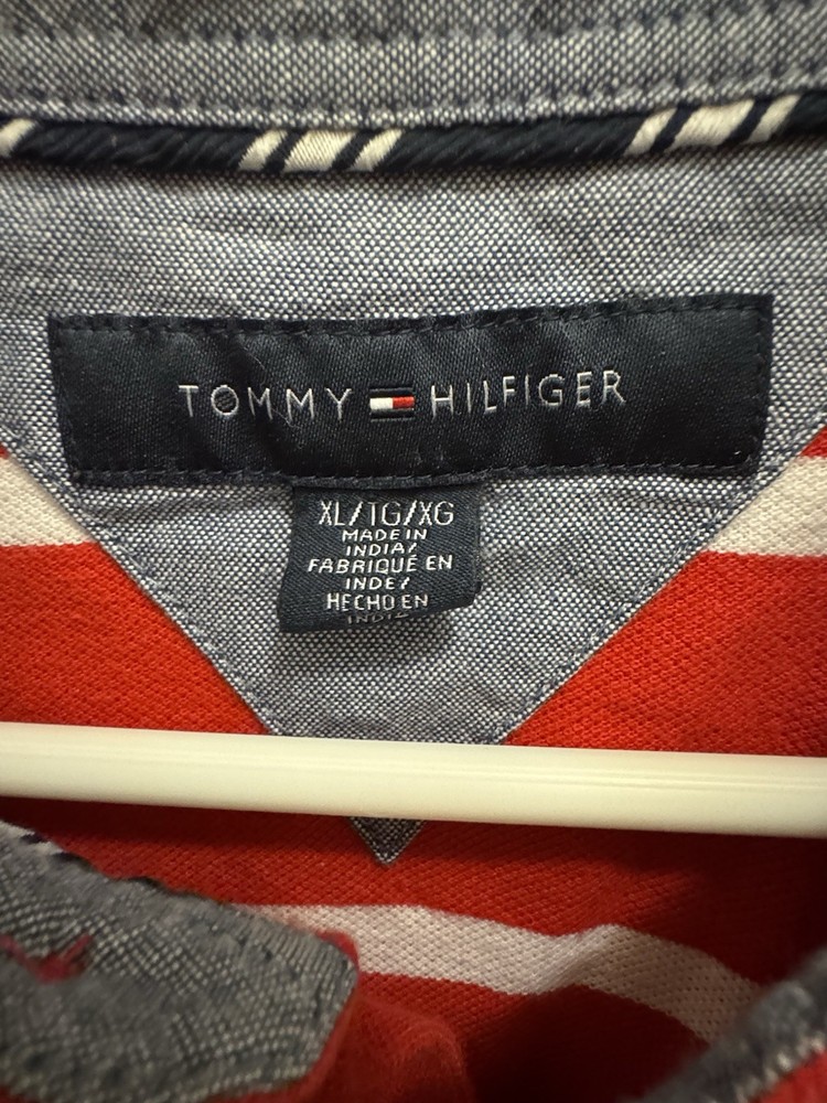 This Tommy Hilfiger Polo Shirt in Men's XL is a stylish and versatile addition to any wardrobe. Made from comfortable cotton knit fabric, it features a classic red and white striped pattern with a collared neckline and button closure. Suitable for a variety of occasions such as travel, casual outings, workwear, or business meetings, this shirt is machine washable for easy care. With its Tommy Hilfiger logo accents and regular fit, this polo shirt is perfect for everyday wear in any season. See photos for item condition. SKU: M117