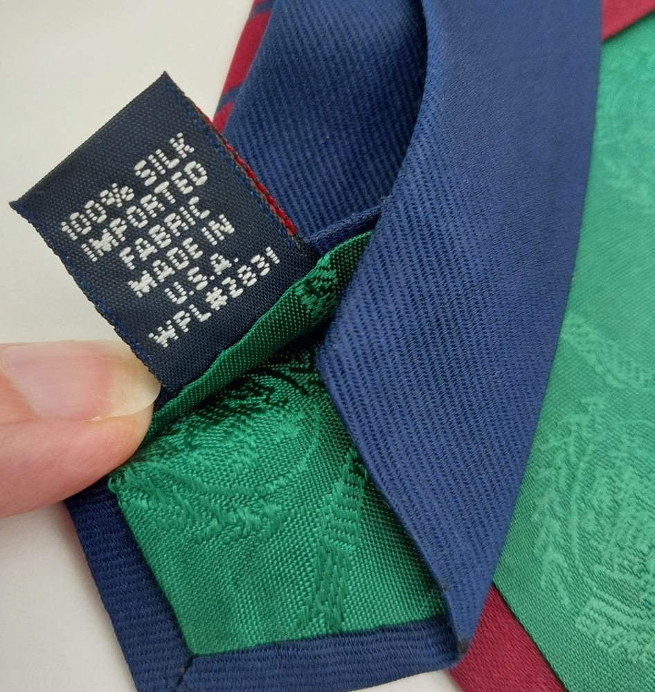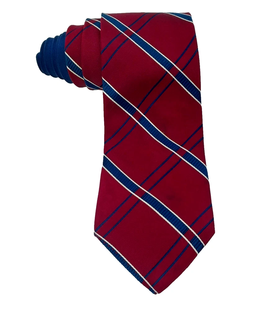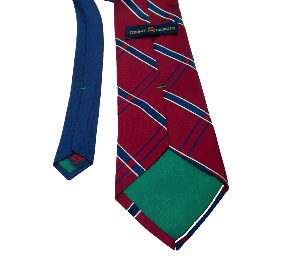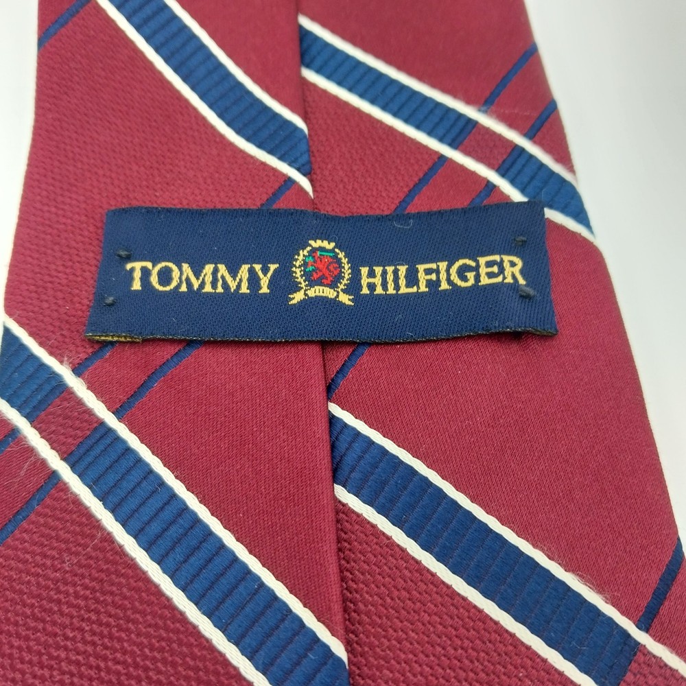 This is a Tommy Hilfiger necktie made in the USA from 100% silk. It features a classic striped pattern in dark red, white, and blue. The tie is 60" long and 3 1/2" wide at the tip. Preowned in good condition.