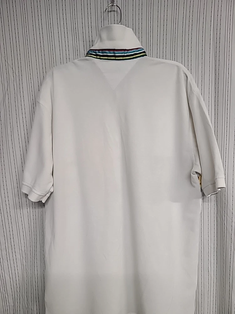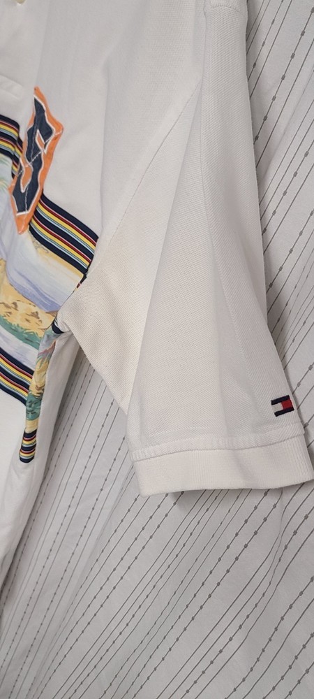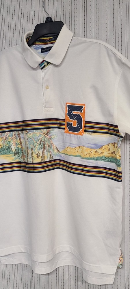 Add a touch of classic and modern style to your wardrobe with this Tommy Hilfiger men's polo shirt in size XL. The shirt features a white color with an embroidered logo, a button-down collar, and short sleeves. It has a pullover closure and is made of a lightweight and easy-care fabric that is perfect for all seasons, including winter, summer, fall, and spring. The shirt also has a graphic print pattern with palm trees and a tropical theme, making it perfect for casual occasions and walking activities. It has pockets and is machine washable. The shirt is a great addition to any wardrobe and can be paired with jeans or shorts for a classic and stylish look. Good pre-owned condition. Professionally Laundered. Stored in AC pet smoke free facility. Thanks for shopping by.