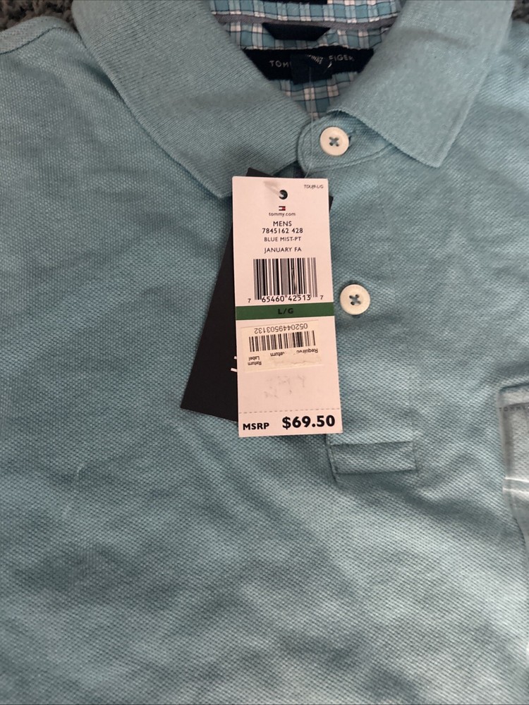 This is a Tommy Hilfiger men's button-up shirt in a slim fit, size large, with a 1/4 button design. It features short sleeves and comes in a stylish blue color. The slim fit of the shirt gives it a modern and flattering silhouette, making it a great choice for a casual yet smart look.