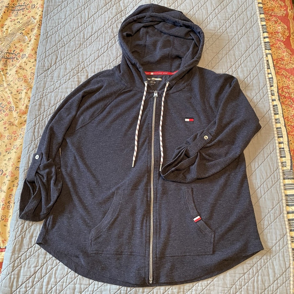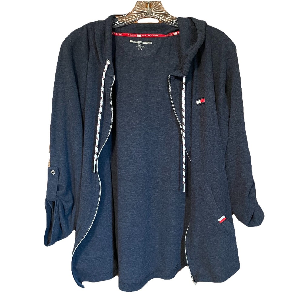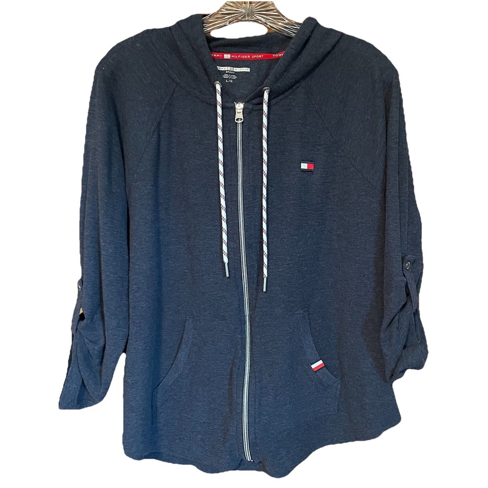 Tommy Hilfiger Sport Full Zip Cotton Blend Hoodie Pockets Blue Womens Size Large Roll tab sleeves Previously owned, excellent condition. *See photos for details and measurements. Arrives freshly laundered! I consider all reasonable offers! Fast shipping: I ship out the following business day! A13