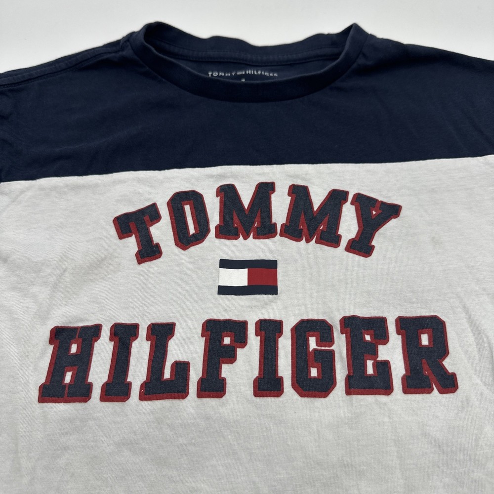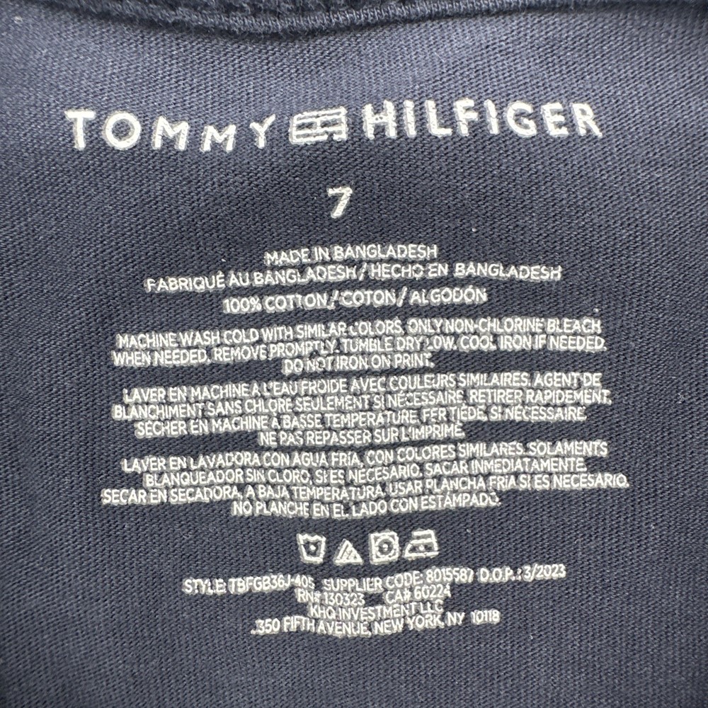 The product is a Tommy Hilfiger T-Shirt in youth boy size 7, featuring a graphic print logo on the front. Made from 100% cotton, this short sleeve shirt with a crew neck and pullover closure is perfect for casual occasions. The classic blue color and Tommy Hilfiger brand logo give it a stylish and timeless look, while the regular fit ensures comfort for active boys. Easy to care for, this basic T-shirt is a wardrobe staple for young boys who appreciate quality and style. *Check the images above for the flaws and measurements of the item.