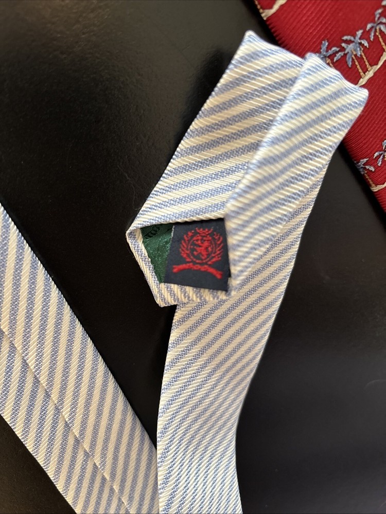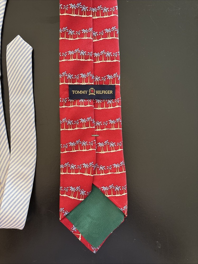 This is a tropical-themed Tommy Hilfiger tie featuring a red color with palm trees pattern. It is made of 100% silk, in a classic size and style with logo accents. This vintage tie is from the United States and has a classic width. Perfect for men looking to add a touch of tropical flair to their outfit.