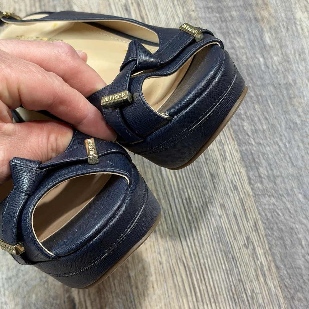 Tommy Hilfiger Twkarra wedge sandals in a navy blue textured finish. Stylish peep toe design with slingback strap and buckle closure. Comfortable wedge heel makes them easy to wear for casual or dress occasions. Details Brand: Tommy Hilfiger Model: Twkarra Size: Womens 8M Style: Wedge Sandal / Slingback Color: Navy Blue Toe: Peep Toe Closure: Adjustable buckle strap Material: Man-made materials Features Wedge heel platform design Slingback strap with gold-tone buckle Peep toe front Bow detail with Hilfiger logo hardware Textured faux leather upper Cushioned insole Durable rubber outsole Condition: These look like they have never been worn outside. No original box and the left insole has what looks like glue? NOTE: Please see all photos for condition as all flaws will be shown throughout the photos! * COLORS MAY BE DARKER OR LIGHTER OR SLIGHTLY DIFFERENT DUE TO MONITOR/PHONE/TABLET SETTINGS.