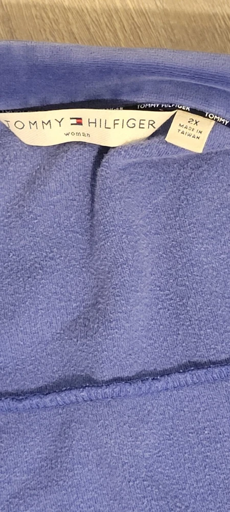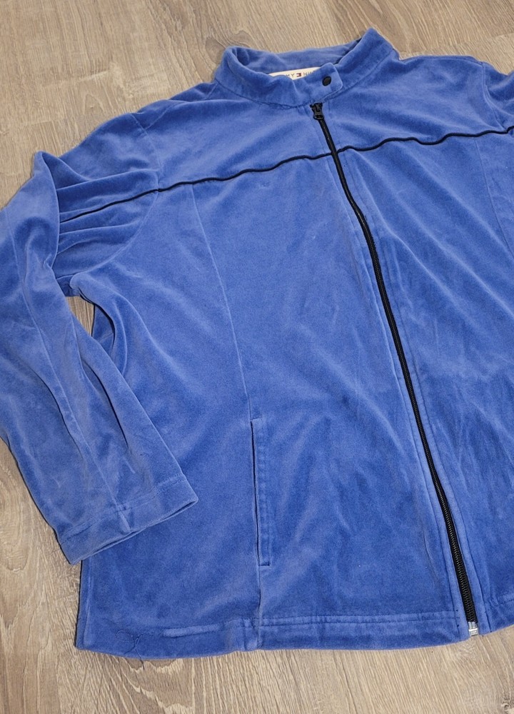 For sale is a women's Tommy Hilfiger velour jacket in size 2X. This jacket features a solid pattern with contrasting trim and pockets. It has a relaxed fit and long sleeves with a zip closure. The jacket is part of a tracksuit set that includes one piece. This versatile jacket is perfect for travel, activewear, and casual occasions. It is machine washable and suitable for all seasons, including winter, summer, fall, and spring. The jacket comes in a beautiful blue color and is made of high-quality velour fabric. FS1