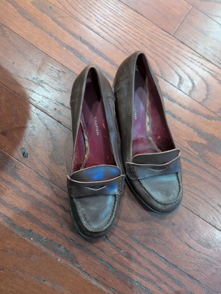 These Tommy Hilfiger loafers are women's slip-on shoes in a dark brown color, featuring a low block heel for added comfort. With a round toe shape and a low top shaft style, they are designed for casual wear. The shoes are made of leather with a synthetic lining, offering a stylish and durable option for everyday use. The slip-on closure and rubber outsole make them convenient and practical for on-the-go activities. Perfect for a casual and comfortable look, these loafers are a versatile addition to any wardrobe.