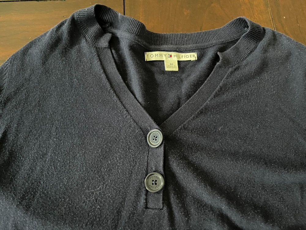 Elevate your wardrobe with this Tommy Hilfiger women's cardigan. The classic and preppy style is perfect for any occasion. Made of high-quality cotton, this sweater is comfortable and durable. The V-neckline adds a touch of elegance to the navy blue color. This cardigan is perfect for any woman looking for a designer piece to add to their wardrobe.