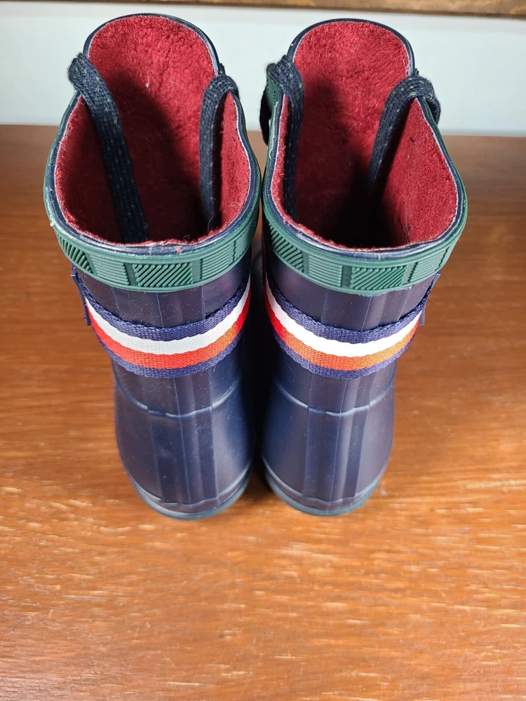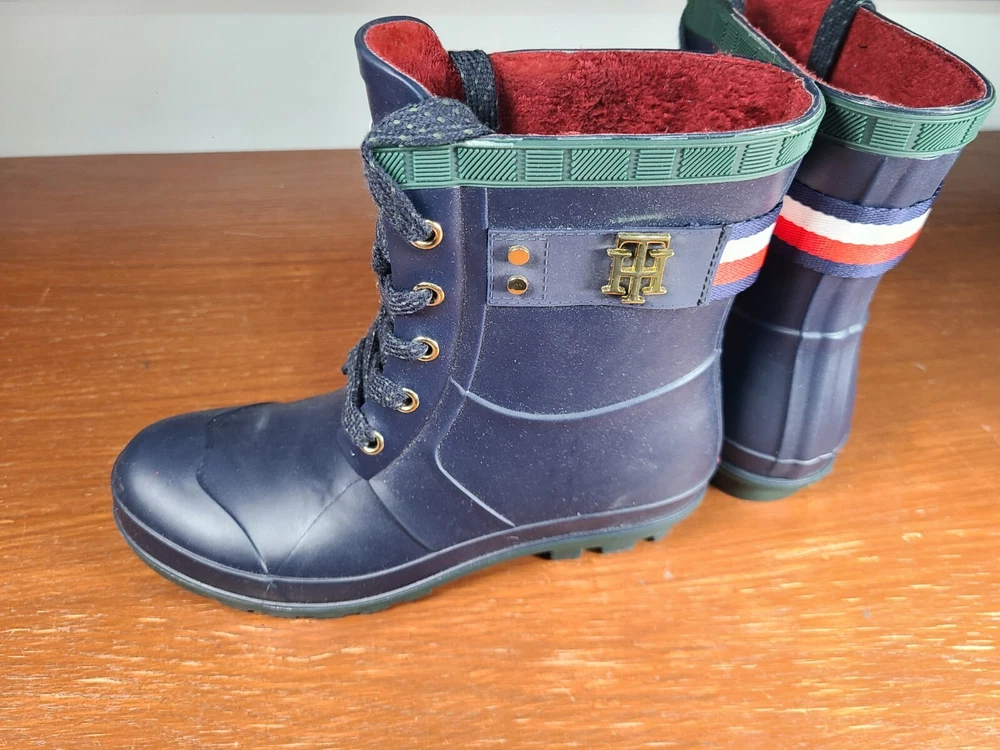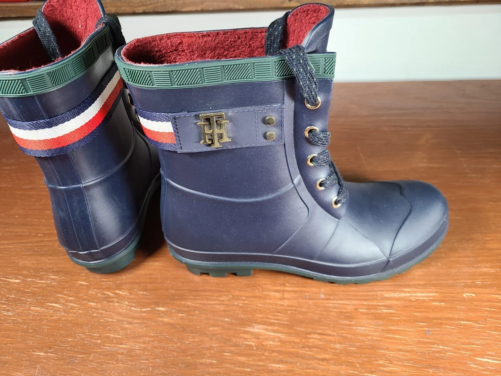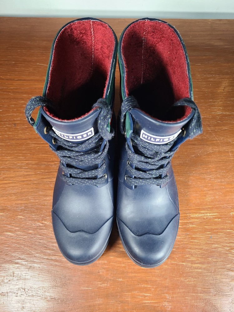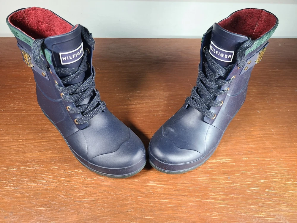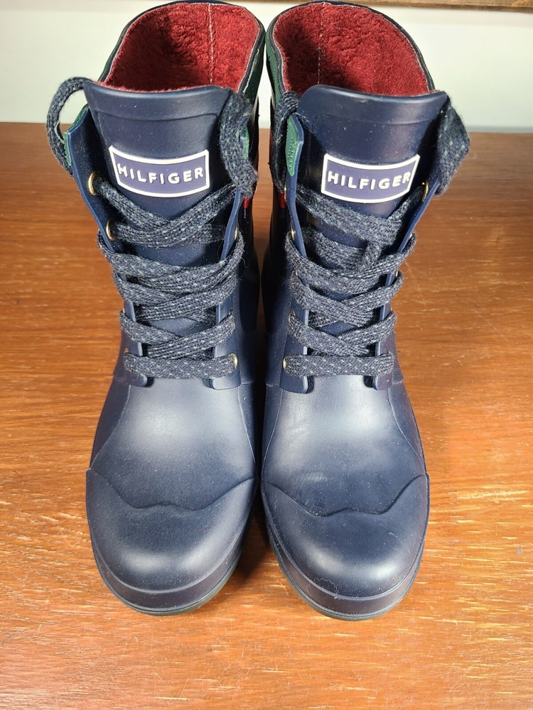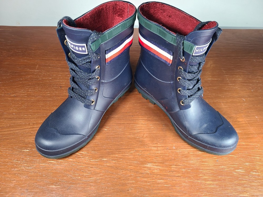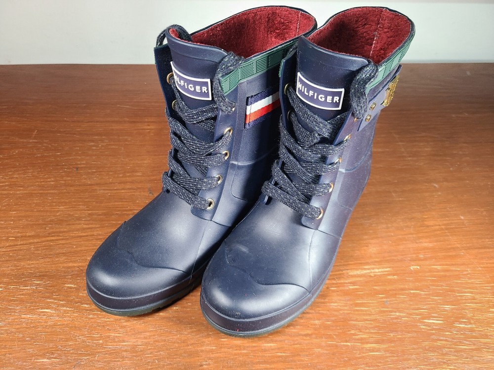 Tommy Hilfiger Renegade Short Rubber Rain Boots Women's Size 6 Navy Blue Lace Up. Tommy Hilfiger Boots are in preowned condition. See pictures for details. Please ask any questions before purchase. If there is any issue, please contact us first before leaving feedback. Thank you.