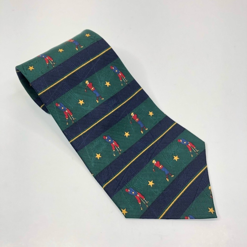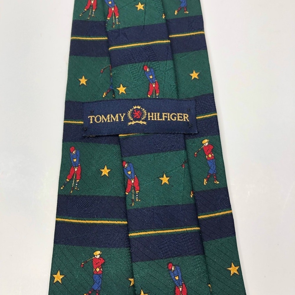 Green and blue striped necktie from Tommy Hilfiger. Designed with golfers and stars. 100% silk. Approximately 4" across at widest point and 57.5" long Golf, Preppy, Sport, Gift, Dad, Father's Day, Christmas, Vacation, Special Occasion