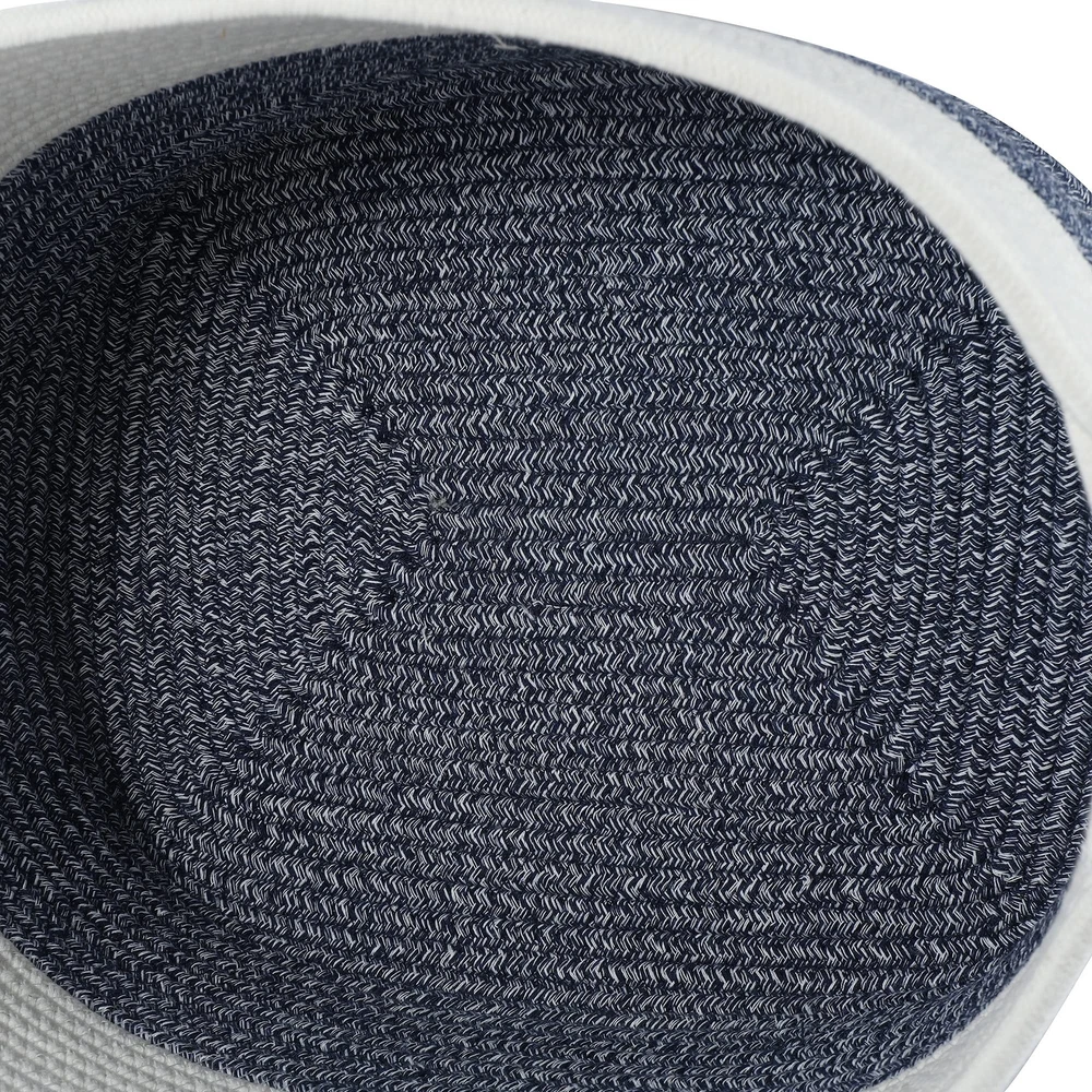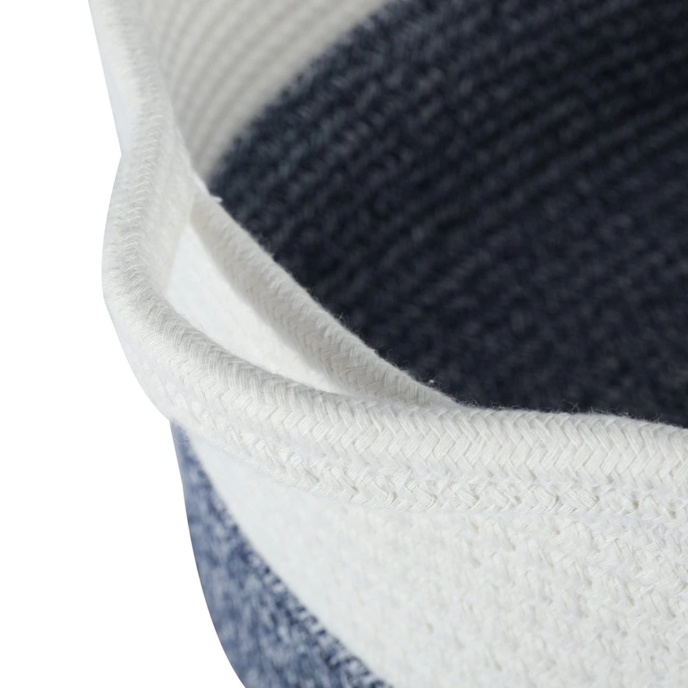 13" x 9.5" x 9" A stylish toned blue and white cotton rope dog toy storage basket will be a great addition to your home decor. This makes for an easy way to your dog's toys. Top access allows them to pick and choose what they want.