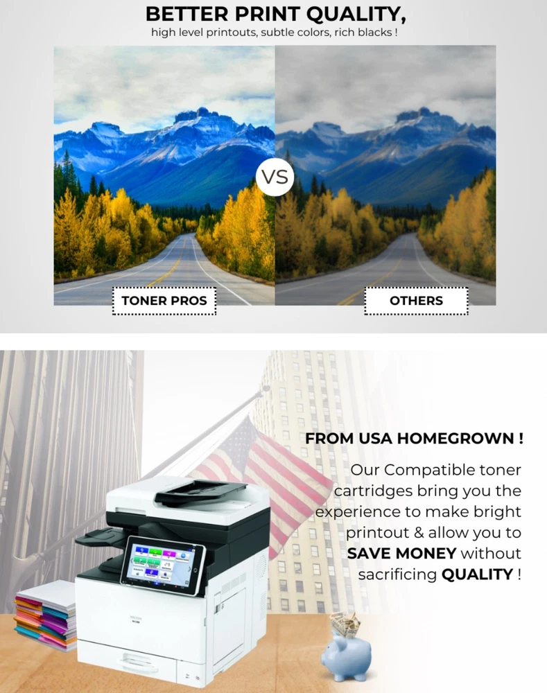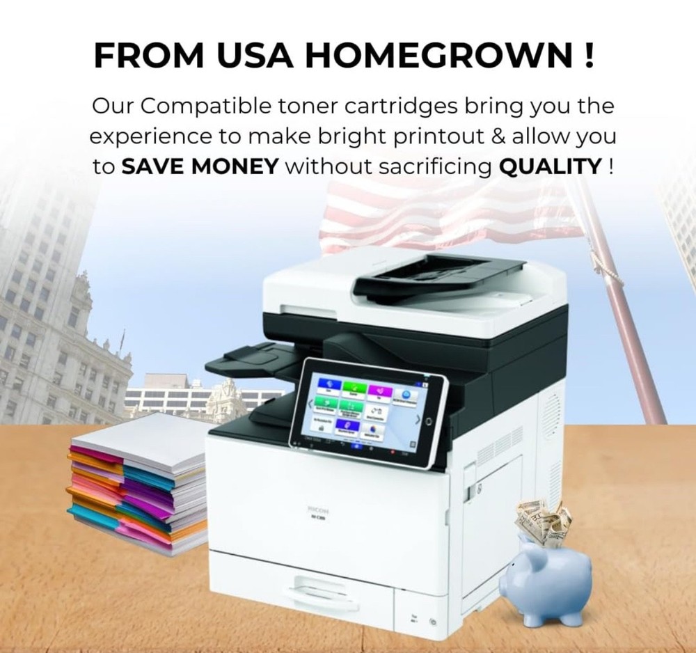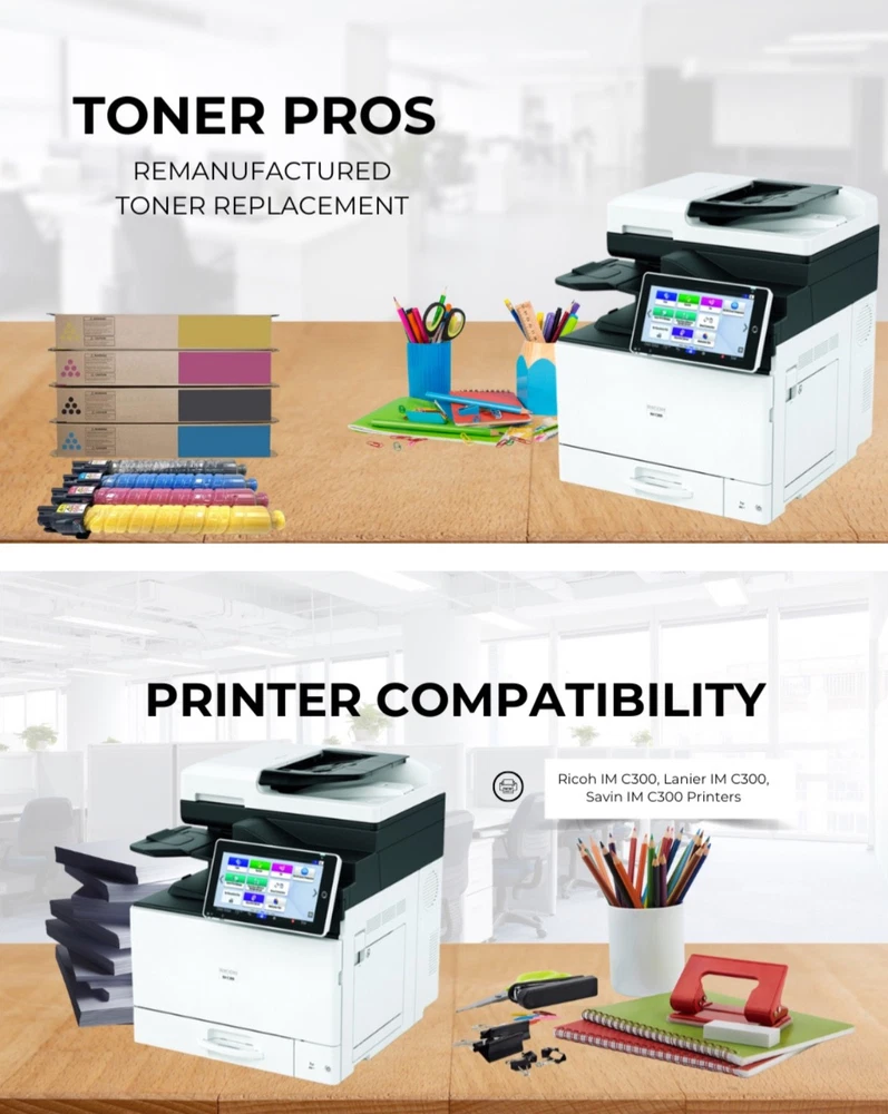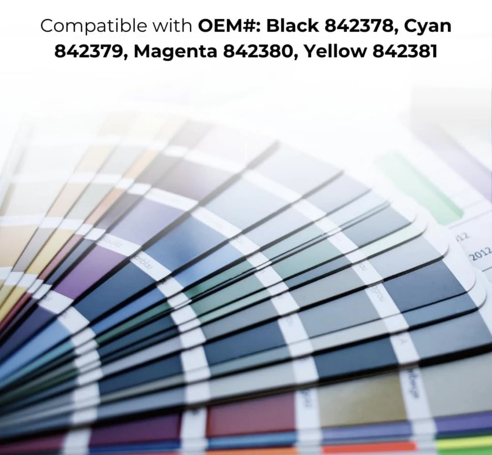 #2762 Toner Pros Compatible Ricoh 842378, 842379, 842380, 842381 High-Yields Toner Cartridge β Replacement for IM C300, Lanier IM C300, Savin IM C300 Printers- 4 Color Pack, Black 17,000 & Color 6,000 Pages Brand Toner Pros Color Black-Cyan-Magenta-Yellow Item Weight 1.72 Kilograms Included Components Toner Cartridge Compatible Devices Printer Compatibility Options Compatible, OEM ππππππππππ πππππππ ππππππ: Compatible with IM C300, Lanier IM C300, Savin IM C300 Ricoh printer toner Models. ππππππππ πππ πππππππππππ: Compatible Replacement for OEM#: Black 842378, Cyan 842379, Magenta 842380, Yellow 842381. ππππ πππππ: This Ricoh 842378 toner Print 17,000 pages per 842378 black and 6,000 pages per 842379 cyan, 842380 Magenta, 842381 Yellow toner cartridges at 5% coverage on letter or A4-sized paper. Please note that yield may vary based on the image area coverage and print mode selected. πππππππππππ πππππ πππππππ: Our compatible Ricoh 842379 toner cartridges provide an exceptional printing experience, producing vibrant printouts without compromising on quality. ππππ ππππππππππππ: This compatible Ricoh 842381 toner engineered for a quick and hassle-free setup, this cartridge is designed to fit and function smoothly, minimizing downtime and keeping your workflow uninterrupted. What's in the box Toner Cartridge