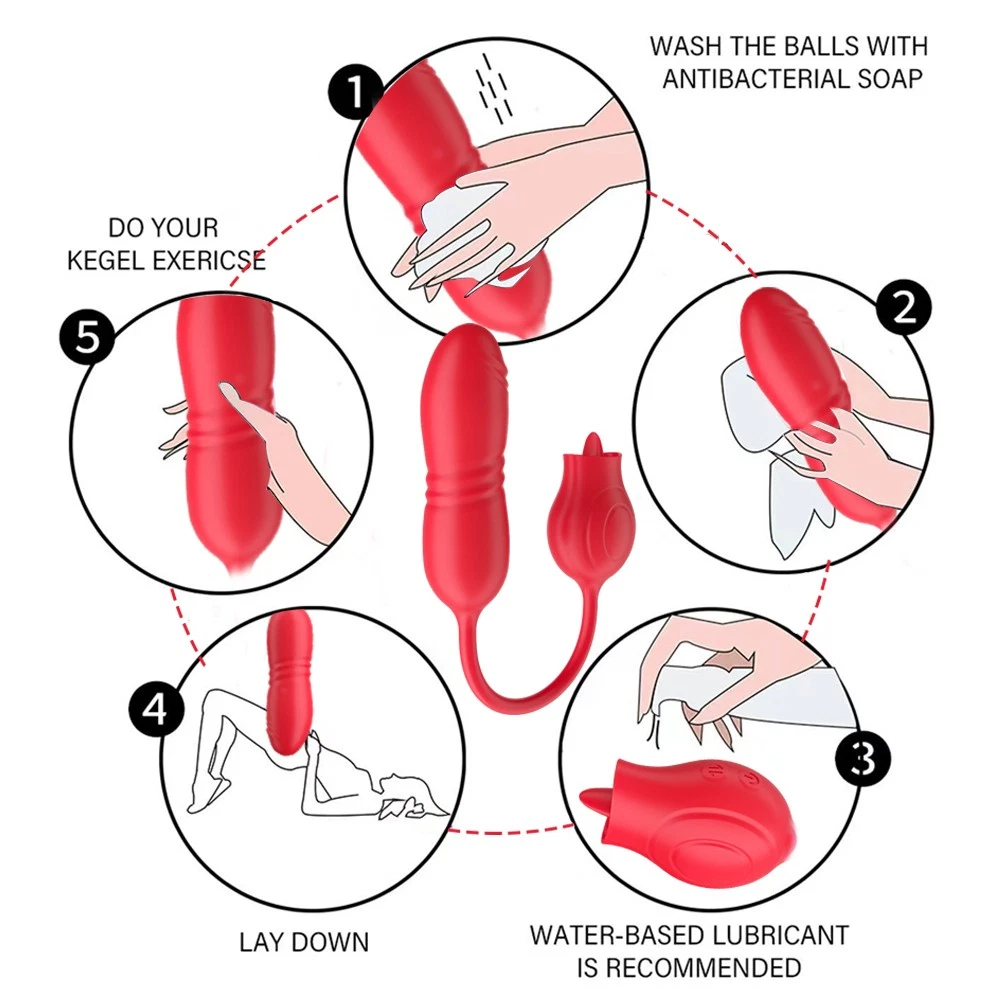 Guarantee 100% discreet shipping on the package and no wirtting on package. P R ODUCT SPECIFICATION: Product Name: Tongue Licking&Thrusting vibrating Egg Material: ABS & Food Grade silicone Product size: as pictures shown Accessories: USB charging cable Battery capacity: 500mAh Rated voltage: 3.7v Power supply: Built-in Lithium Battery Noise: ≤55db Charging Time: 2h Using Time: 40mins KEY FEATURES: Food grade silicone; 7 Stretching modes; 8 Licking modes; Bending easily; IPX7 waterproof BUTTON DESCRIPTION: Open button: Switch on by pressing 2 seconds. Switch of by pressing 2 seconds. After power on, press the button to enter Licking Mode. Enter next mode by pressing the button again, there are 3 speed modes &5 freuency modes in total. Conversion button:After power on, press the button to enter Thrusting Mode. Enter next mode by pressing the button again, there are 3 speed modes & 4 frequency modes in total LED INDICATOR: Power on:Indicator on Working:Indicator flashes when pressing button P ower ofF:Indicator ofF State of charging: Low power:Indicator lashes slowly for 5 times and the vibrator of automatically. Charging: Flashing Fully charged: Indicator off. ATTENTION: 1.Please check ifthere is any damage caused by transportation, ifyes, please contact suppliers for replacement. 2.Please read and follow the user manual before using· 3.This product is for adults use only can NOT be used as a contraceptive. 4.Please put the product in proper condition and out of the reach of the children. 5.Please do NOT exert excessive force when using to avoid injury. 6.Please do NOT Share the product with others. 7.Please immediately stop ifyou feel any uncomfortable when using this product. 8.Please check the condition ofthe product regularly,please stop using if any damage is found. NOTE: Please fully charge before use for the frst time. PACKAGE: 1*Vibrator Massage 1*Charging cable