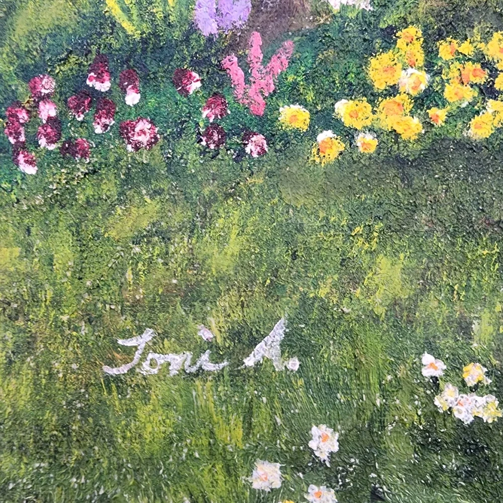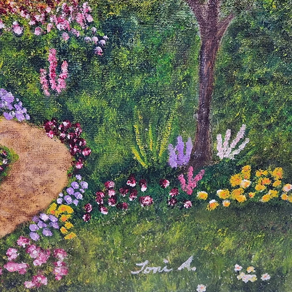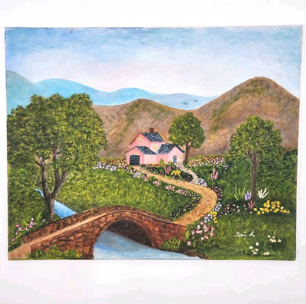 Toni A. Painting Landscape House Woods Bridge Original Signed Folk Art 20"x16"