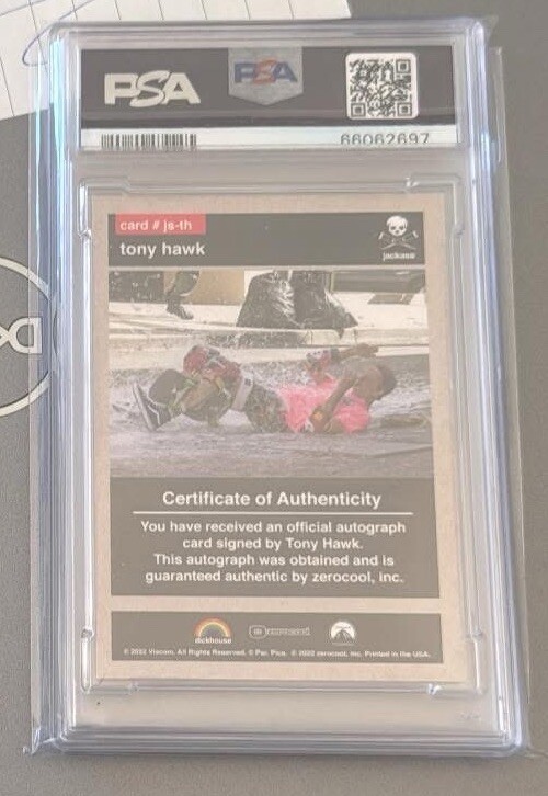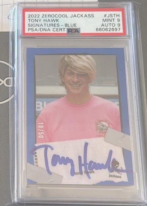 Dive into the world of collectable cards with the Tony Hawk Jackass Zero cool Auto/50, a standout piece for enthusiasts and fans alike. This non-sport trading card, featuring the iconic Tony character from the Zerocool franchise, is a must-have addition to any collection. With only 50 of its kind, this card boasts an impressive PSA 9 rating, ensuring its quality and rarity. It's a perfect find for collectors seeking to expand their assortment with a unique and valued item that celebrates the spirit of adventure and excitement.