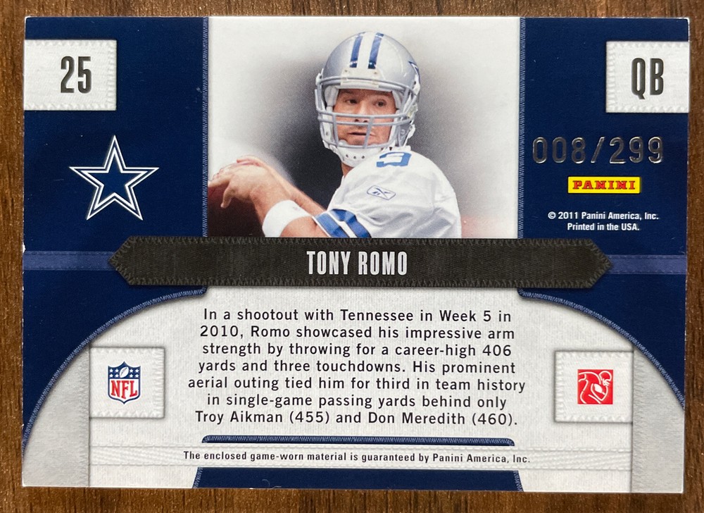 TONY ROMO PATCH 2011 PANINI THREADS GAME DAY JERSEYS PRIME /299!! There are a couple of small decolored areas on the edge of the card on the back. Please see pictures.