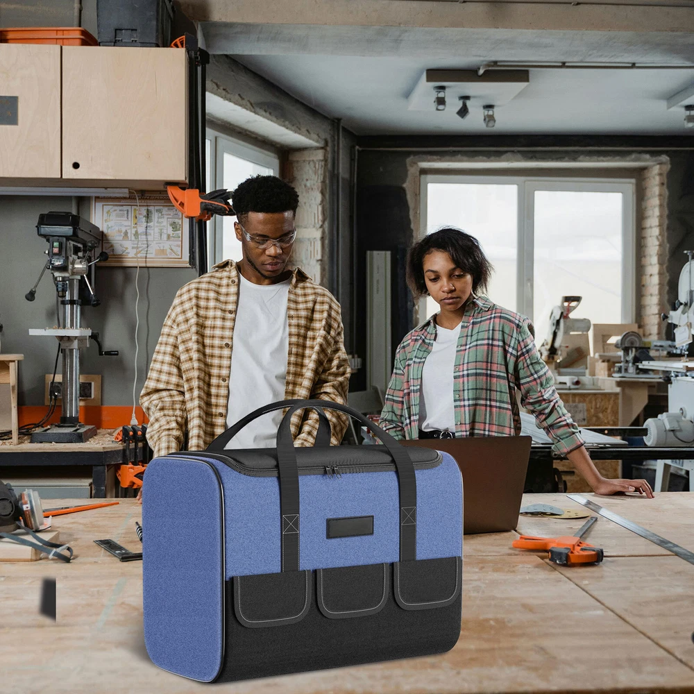 Product Description Bout this item: 👷♂️ Keep Your Tools Organised: with our tool bag designed for DIY enthusiasts and craftsmen. This tool bag is perfect for storing and organising your tools and materials. 👷♂️ High-quality Materials And Structure: Our tool bag is made of 5 layers of 1680D Oxford fabric, providing excellent durability and stability. Waterproof, finely stitched, and able to withstand heavy use. 👷♂️ Large Space and Multiple Pockets: Our tool bag features 1 strong inner pocket and 5 outer pockets, providing ample space to store various tools and materials. It is robust and versatile. 👷♂️ Multifunctiona Tool Bag : Ideal for DIY enthusiasts and craftsmen, but also for electricians or plumbers. It offers a practical solution for storing and organizing tools effectively. Specification: Material:‎Polyester Color :Blue Size: 16.93x9.25x11.8 inch Water Resistance Level:Water Resistant Number of Compartments:5 Included Components: ‎1 Tool Bag powered by