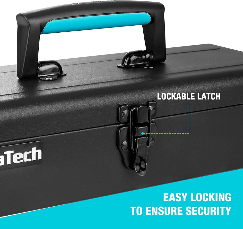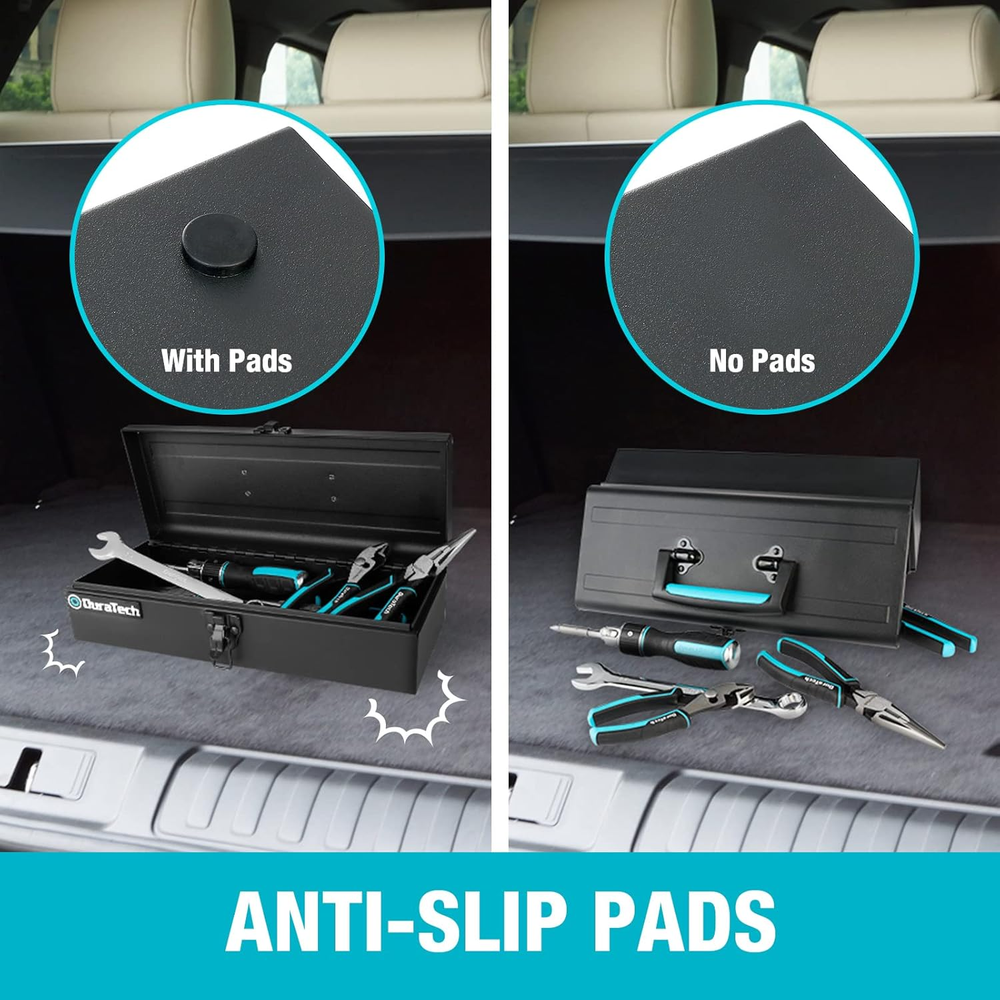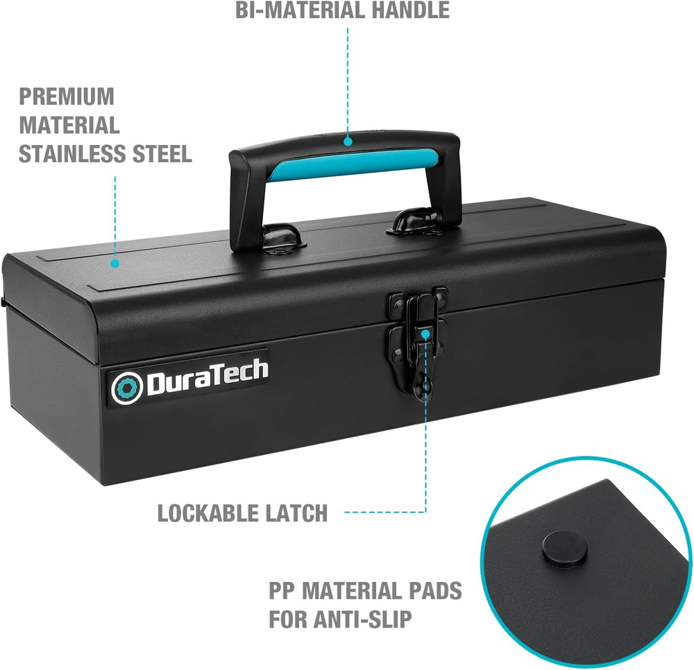 [STURDY & DURABLE] The entire tool box uses high quality carbon steel, which is strong and durable and not easily deformed and damaged when used. Metal surface spray-painted treatment makes it easy to clean and preventing rust. [PORTABLE] 15-inch small handheld tool box is ideal for the car and household use, lightweight for carrying. Outside dimensions: 15" x 6-7/8" x 3-7/8". Internal size: 14-1/8" x 5-3/4" x 2-1/8". Item Weight: 3.3 lbs. Rated up to 30 lbs. [ORGANIZATION] DuraTech Tool Box Organizer can contain your hammer, screwdrivers, wrenches and pliers among many others while keeping the tool kit organized. [LOCKABLE LATCH & ANTI-SLIP PADS] The 4 non-slip foot pads design at the bottom makes it stable in structure. Equipped with a plastic Non-slip handle and a steel latch with small padlock eye, keep your hand tools safe (LOCK NOT INCLUDE). [WIDELY APPLICATION] Great organizer as first aid box, trailer toolbox, mechanic tool box, car tool box, professional tool box, kids tool box and much more.A choice as Christmas gifts for women, men and kids, orangized the hand tools. Product Description Professional Quality DuraTech metal tool box is made of heavy-duty steel, fine workmanship and beautiful design. A necessary tool storage box for every family. DuraTech 15" Portable Steel Tool Box Hand-friendly matting body and anti-slip design upgrade your use experience. Metal connecting shaft:Open and close smoothly, strong and sturdy. Toolbox outside dimensions:15" x 6-7/8" x 3-7/8". 15-inch small tool box is ideal for household use, lightweight for carrying. Rated up to 30 lbs. PRODUCT DETAILS ERGONOMIC HANDLE Non-Slip handle for more comfortable and firm to hold, more convenient to carry STABLE SAFETY LOCK Lockable latch design allows you to lock and ensure your tools safety ANTI-SLIP PADS 4 Non-slip pads can effectively prevent the box from sliding, reduce noise and protect your floor