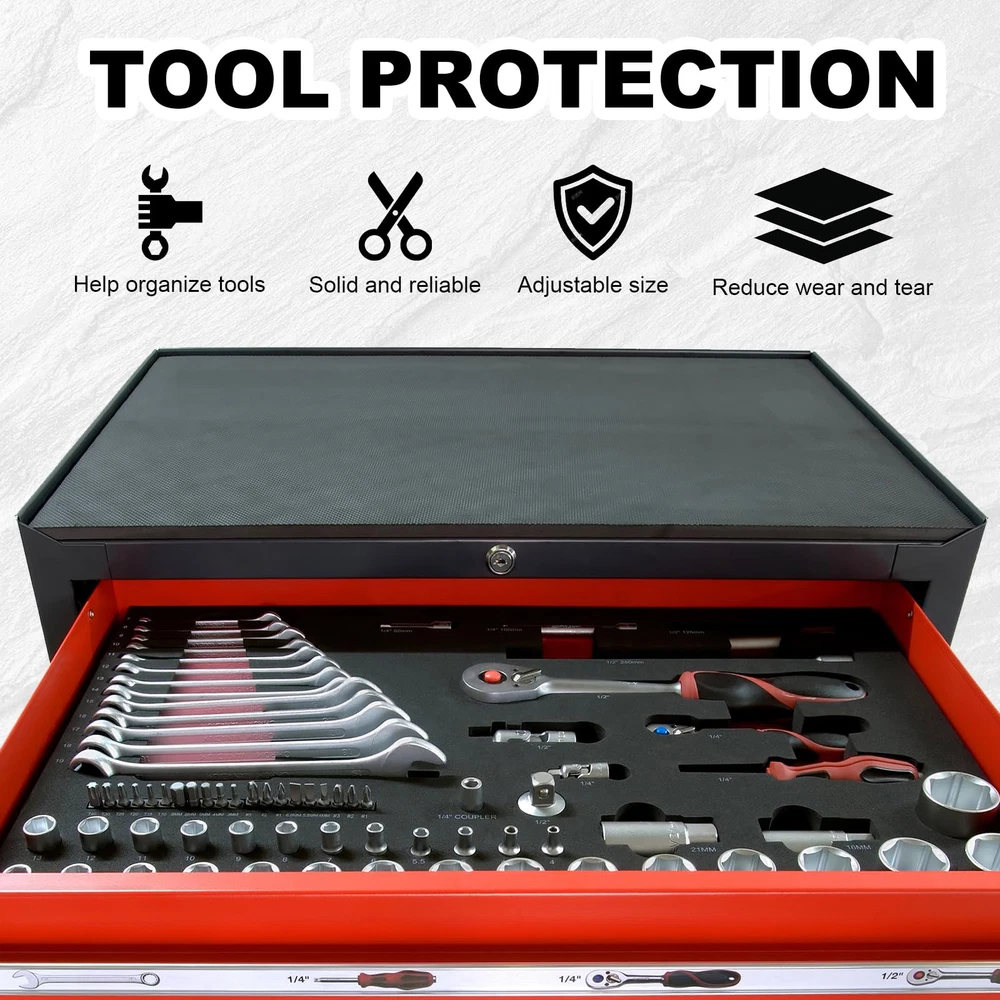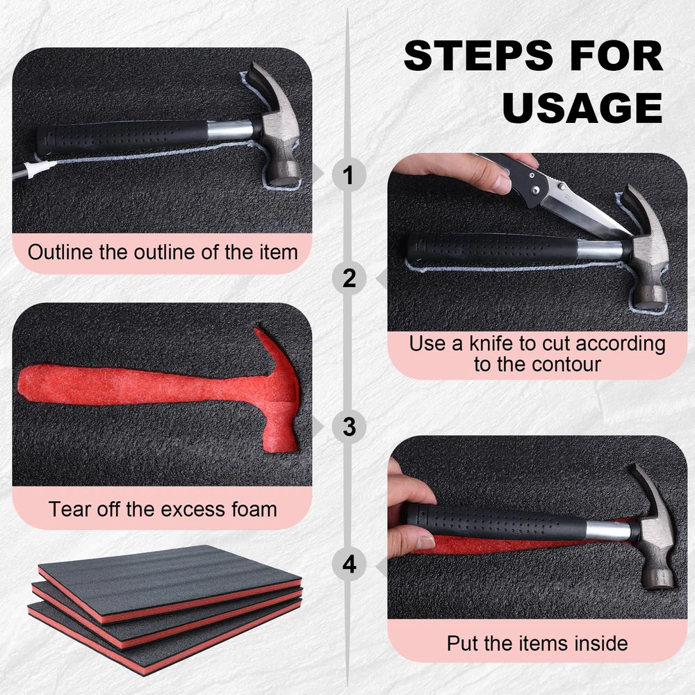 Reliable Material:Made from premium polyethylene foam, tool foam inserts provide stable and reliable protection for your tools and items. Foam tool box inserts is lightweight yet sturdy, kaizen foam offering effective cushioning without adding extra weight Protects Tools and Items: Foam inserts for cases offer protection, cushioning tools from impacts and preventing scratches or damage. With designated spots for each tool, shadow foam prevents tools from colliding with one another, save time and effort Customizable Size:Tool organizer foam can be cut to fit your tools perfectly. With simple tools, you can outline and cut the foam, ensuring an organized and tailored storage solution while giving your toolbox a professional and polished look User-Friendly and Intuitive Design:Toolbox foam feature a black and red color-coded design. The black area is for easy cutting to create custom shapes, while the red section remains intact for stability,makes organizing your tools simple and efficient Wide Application:Foam inserts for toolbox are suitable for a wide range of toolboxes, cases, cabinets, and rolling tool chests. Also be used for DIY projects, shipping, packaging, model making, providing the perfect storage solution for various needs