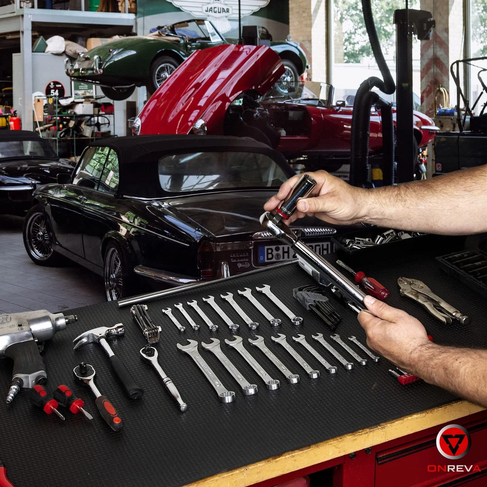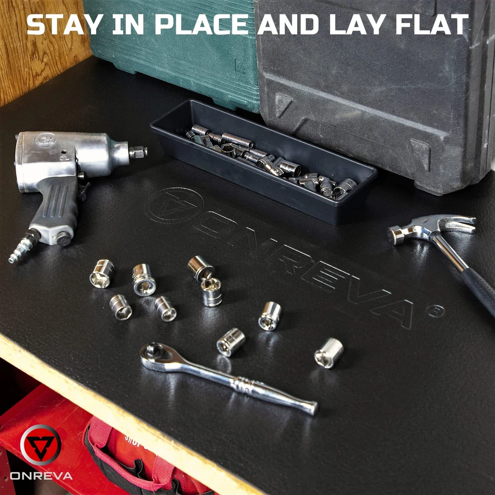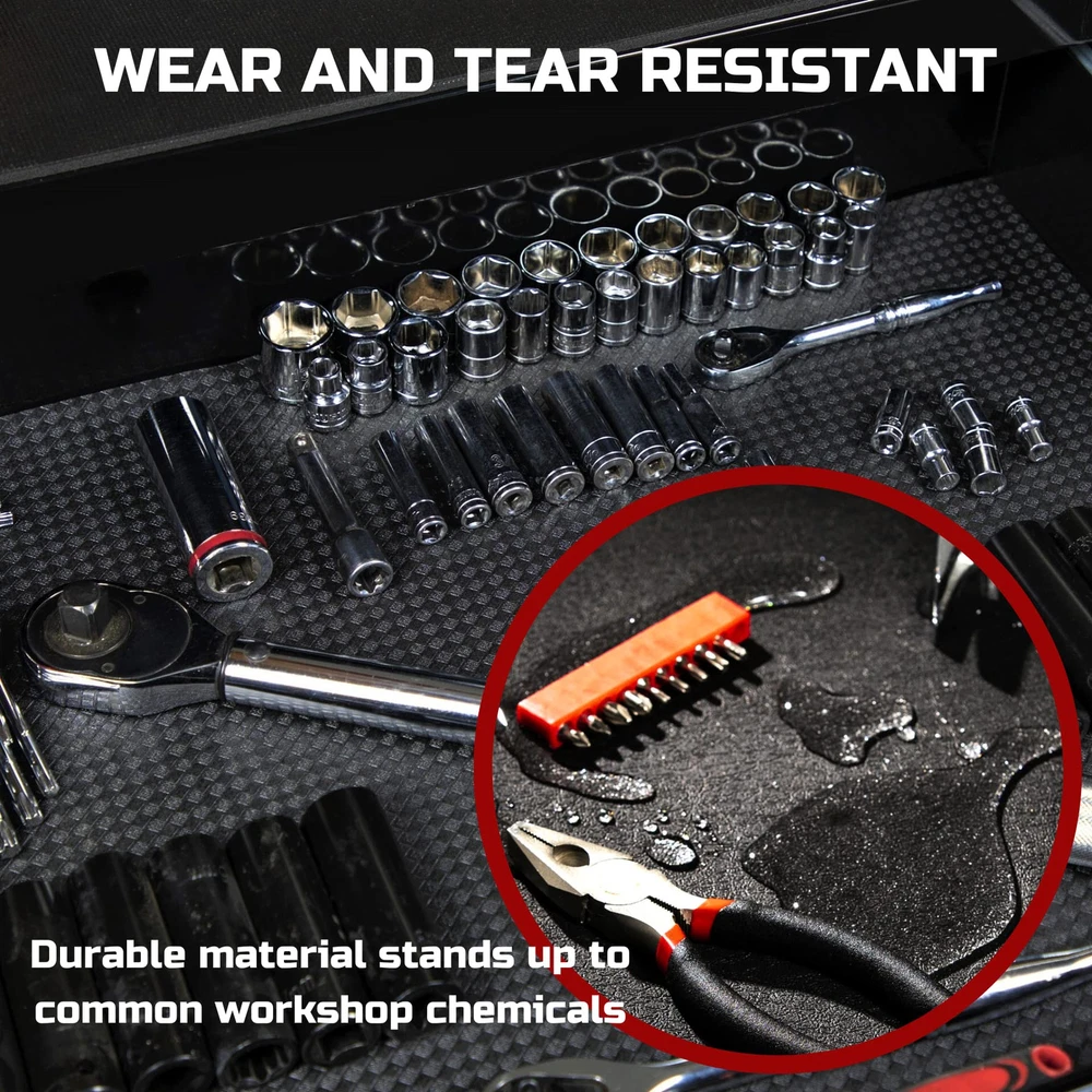 PROTECS DRAWERS & TOOLS: toolbox drawer liners protect your tools from scratching & sliding, Keep your tools and toolbox or workbench in pristine condition with our heavy duty tool box liner; Protects surfaces from grease stains, oil spills, dings and dents. DURABLE & QUALITY: 4mm thickness, made to last with increased protection of natural wear, tear and heat-resistant. Durable material stands up to common workshop chemicals, making it the perfect long-term addition for mechanics and craftsman. The foam rubber mat is tough enough to support any heavy tools; Thick and durable drawer and shelf liner is superior when it comes to durability. ANTI-SLIP ORGANIZER: Non-slip surface grips tools and prevents movement or shifting when drawers are slammed. Our tool box mat keeps your tools in place on the move, in your trunk, or when opening and closing the drawers of your rolling tool chest. EASY TO CUT & PLACE: The rubber foam drawer liner makes measuring and cutting easy so that you can easily and quickly install this liner in any tool box drawers. The tool box liner is perfect to fit any brand tool box such as Craftsman, Snap on, Husky, Milwaukee, US General and so on. 100% SATISFACTION GUARANTEED: You never regret shopping black drawer liner. Quality and customer satisfaction is our priority. We 100% return in 365 days if you are not completely satisfied receiving our toolbox liners, you can feel free to us anytime. SPECIFICATIONS: Tool box liner, Size: 30 inch wide x 22 feet long, thickness: 4mm thick, Material: Rubber, Color: Black, Non-slip surfaces.