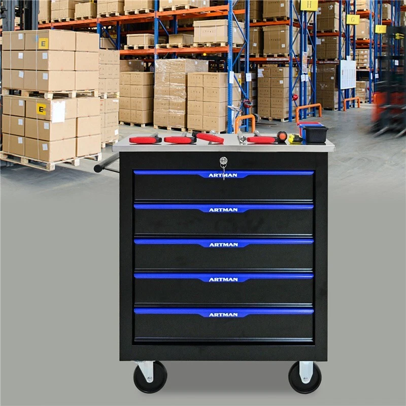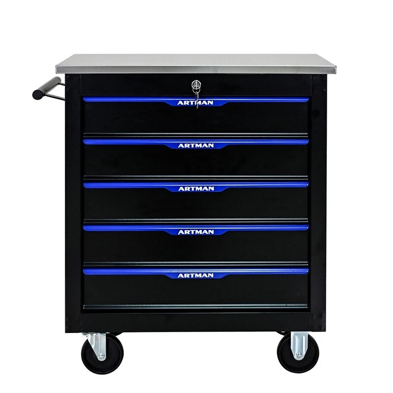 Features and Details: This assembly trolley has 4 steering wheels, 2 of which with parking brakes, so you can move the trolley freely in the garage, but also stop in one place. The storage surface provides additional space for storing and arranging tools you often need. The opening and closing of the drawers of the tool cabinet is very gentle thanks to the ball-bearing drawers. The robust and powder-coated steel construction is used for high wear resistance. This is a set of cabinets, can use a round hook at the bottom of the table to connect another tool car, thus forming a combination. Specification: Color:Black+Blue Material:Cold Rolled Steel Surface Finish:Powder Coating Casters:4" Casters (2PCS with brake and 2PCS without brake) Product Size (with wheels and countertops): 25.91*13.58*26.46INCH Package Size:27.36*15.16*28.94INCH Size (with countertops):25.91*13.58*25.98INCH Net Weight:58.86LBS Gross Weight:65.7LBS