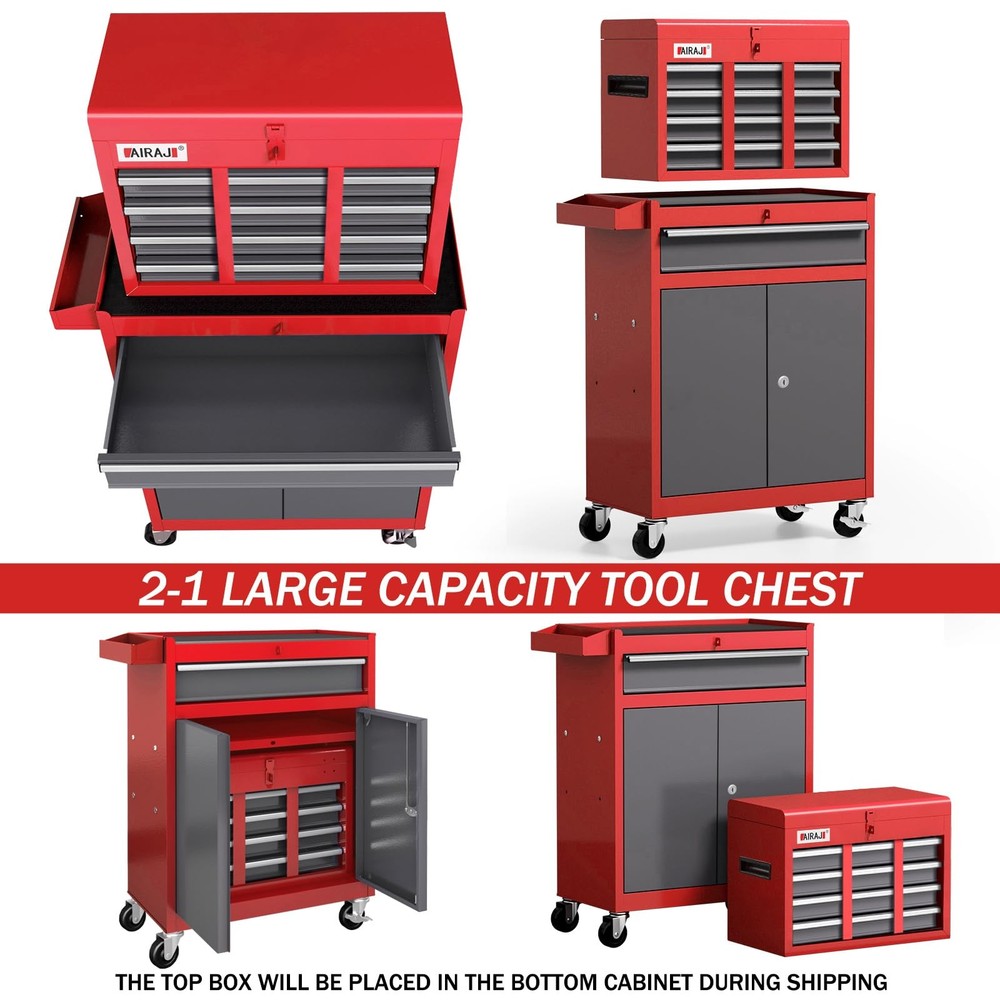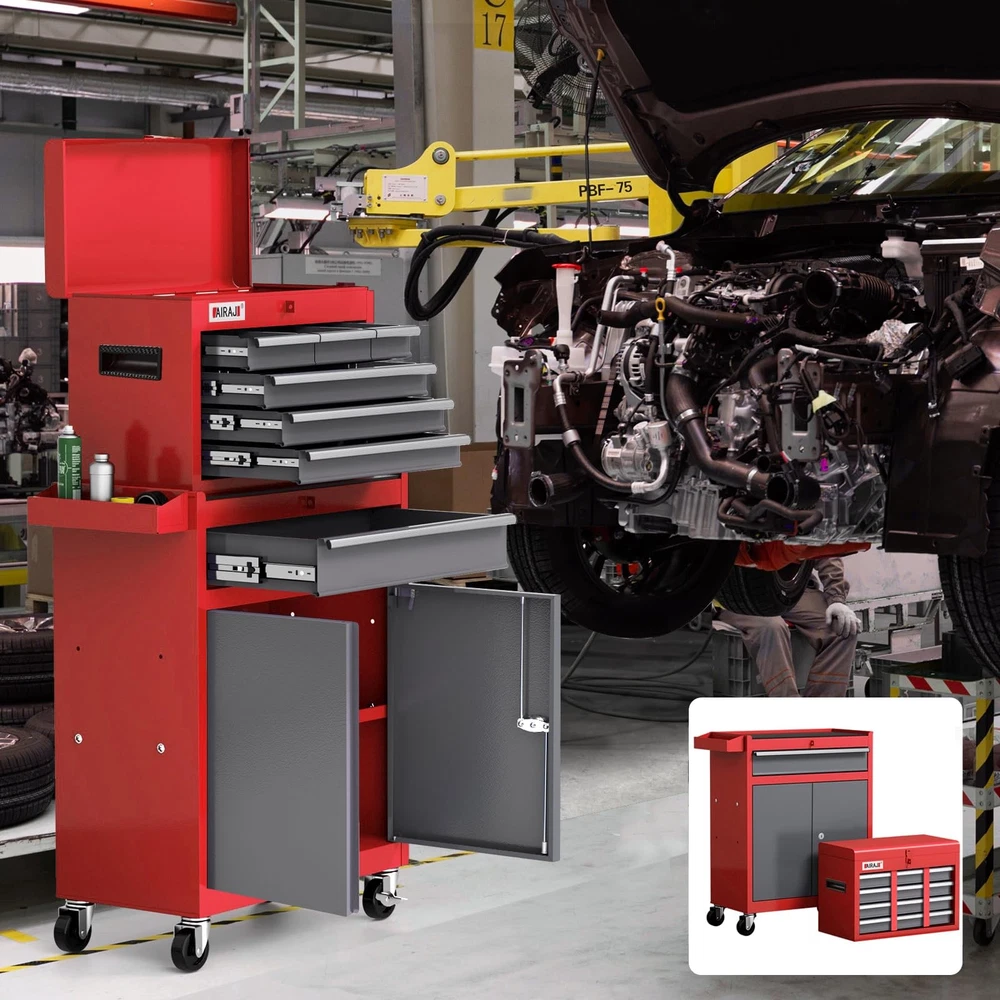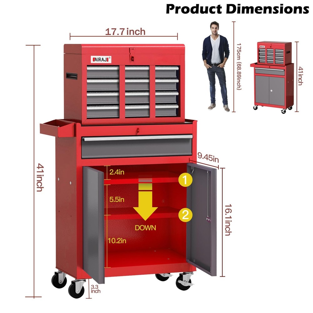 Tool Chest 7-Drawer | 40'' H Rolling Tool Chest with Wheels | Detachable Top Metal Tool Box | Garage Storage Cabinet for Repair Room,Warehouse | Rolling Tool Box with Hooks,Liners,Tray Divider | Red About this item 1、 Tool chest is made of durable cold-rolled steel for high strength, and the surface is powder-coated for wear and rust resistance.It can easily store and transport a variety of supplies and tools. 2、Tool chest with wheels - 4 X 1 inch rubber universal wheels to reduce noise when pushing, and the rear wheels are equipped with brake locking devices to make it more stable and safer when parked. 3、Rolling tool chest - features a double-door design, making it easier to access items, and is equipped with a safety door lock, allowing you to store dangerous items and keep them out of the reach of children. 4、Tool chest with drawers - Equipped with 1 large drawer, 3 medium drawers and 3 small parts drawers, you can store items by size and type, making it easier to store and access tools and keep them neatly organized. 5、Instructions for use - Our packaging method uses corner guards, wooden boards, foam and cartons to effectively prevent transportation damage. And the tool box only needs to install wheels and handrails to use. 6、Attention! If you have any questions, please feel free to contact us and we will provide you with satisfactory answers within 24 hours. Product Description tool chest,rolling tool chest,tool chest with wheels,tool chest on wheels,tool chest with drawers, rolling tool box,tool box with wheels,tool box,toolbox,garage storage On Oct 29, 2025 at 08:46:36 PDT, seller added the following information: