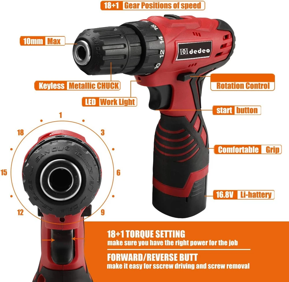 Product Description Tool Set with Drill, 108Pcs Cordless Drill Household Power Tools Set with 16.8V Lithium Driver Claw Hammer Wrenches Pliers DIY Accessories Tool Kit šŸ§°ć€Cordless Drill Set怑- Large 3/8"(10mm) keyless chuck can provide you superior bit retention,Equipped with 3-in-1 working mode, screw driving, drilling and impact drilling, this variable-speed (0-350RPM, 0-1350RPM) and 18+1 position drill is a powerful all-round helper for matching your desires, perfect for professional and DIYers. šŸ§°ć€ High Performance怑-This 16.8V cordless drill with 1500mAh large capacity Li-ion battery, you never need to worry about running out of power in the middle of a project. The battery is simple to change and charge. šŸ§°ć€Ergonomic Handle怑-The anti-slip grip ergonomic handle is made of soft rubber, which fits nicely in your hand. Comes with a trigger-delay LED work light which stays on for ten seconds after you’ve let go of the trigger, useful in dark basements or underneath a vehicle. šŸ§°ć€Highly Durable and Safe to Use怑-All of the tools meet specifications for added safety. No need to worry about your tools getting damaged or breaking while in use. Notice: please make sure the drill driver is fully charged at the first time using. šŸ§°ć€Quality Guarantee怑-This portable tool set is easy to carry allowing you to take your tools with you to work, around the house or outdoors.Our tool set are forged for strength, lasts a lifetime in normal use. If you are not satisfied, we offer a FREE replacement or full refund. About Us We are a reputable seller with many years of experience selling on eBay. Our goal is to provide high-quality products and excellent customer service. Shipping Items will be shipped within 1-3 business days when we received payment. (Orders are not processed on weekends & holidays) Tracking information will be sent once item is shipped. Delivery time depends on destination and other factors Item is shipped to ebay address. Leaving correct address can minimize delay. For international shipping and shipping to Guam, Hawaii and Alaska, Please contact us before placing the order. International buyers please note: Import duties, taxes and charges are not included in the item price or shipping charges. These charges are buyer’s responsibility. We will try our best to reduce the risk of the custom duties. Local pick-up is unavailable at the moment. Contact Us We reply any email messages within 1 business / working days(off-duty at weekend). If you do not get a response from us, then please check your junk or spam mailbox. Our Business hours: Mon-Fri 9:00-18:00, UTC/GMT +8 hours. Please contact us either by clicking "contact seller" in the "purchase history" section or simply click "ask a question" at the bottom of this page. If you are unsatisfied with our item or service, please contact us before leaving any feedback. We are committed to resolve all issues in a friendly and satisfactory manner.