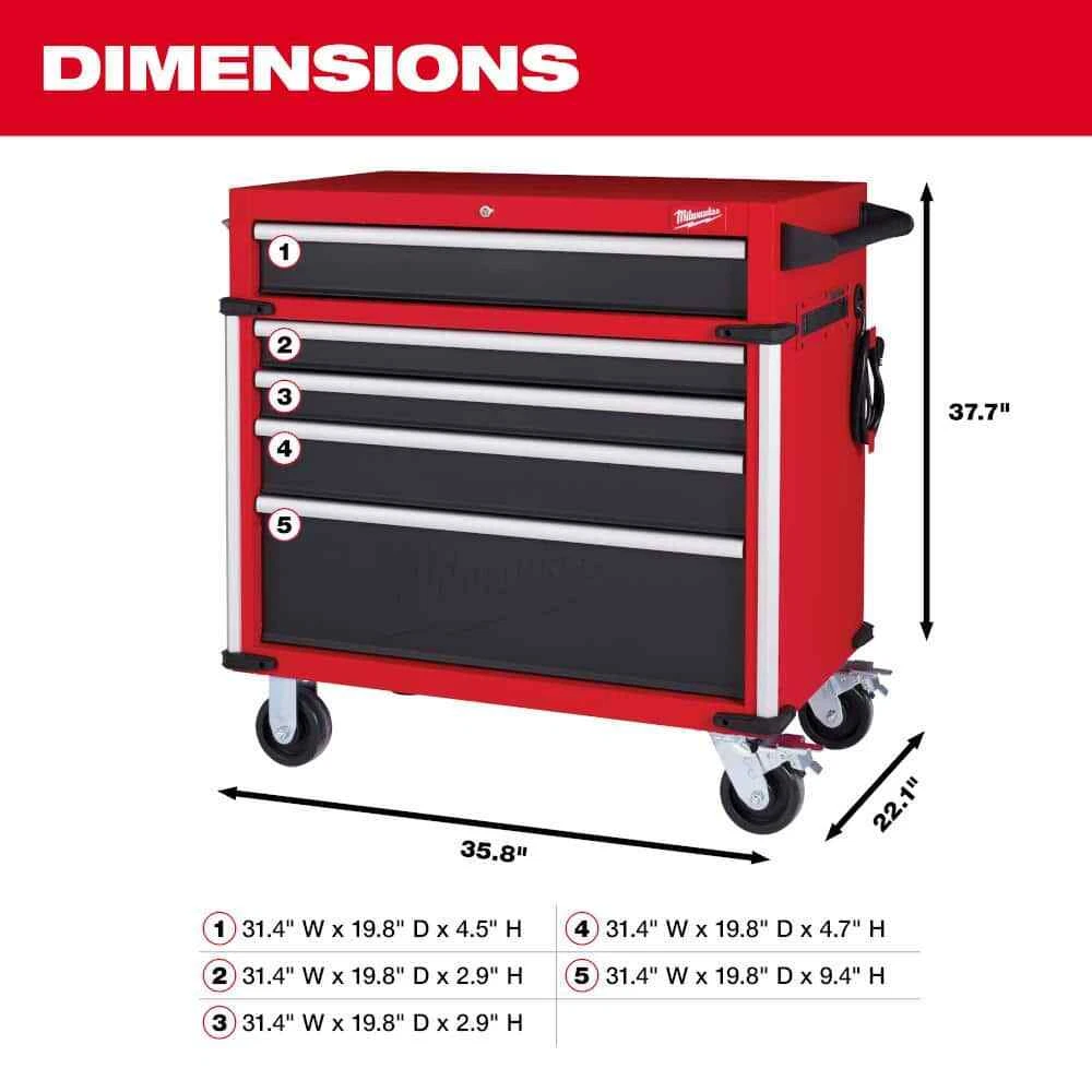 Angle Iron Reinforced Frame for Superior Durability 100lbs Rated Soft-Close Drawers for Smooth Opening & Closing 18Ga Steel Construction & 5" Industrial-Grade Casters The 22 in. D Milwaukee 36 in. 5-Drawer Tool Cabinet boasts a large 15,274 cu. in. of storage capacity and can hold 1,800 lbs. The rolling cabinet features a 4.5 in. D top drawer to easily access your deep socket sets and a 9.5 in. D bottom drawer with a removable power tool organizer, for easy management of your various power tools and battery packs. Mount your Milwaukee battery chargers to the side wall and charge your batteries with the built-in, 6-outlet/2USB power center. The 100 lbs. rated, soft-close, ball bearing drawer slides gently retain the drawers from accidental opening or slamming shut. This tool box also includes a Milwaukee stainless steel bottle opener and stylish aluminum edge guards with rubber corner bumpers to help protect your investment. The red and black textured finish is rugged, durable, and stands up to harsh environments. Combine with the Milwaukee 36 in. 7-Drawer Tool Chest, model# 48-22-8538 for a total storage capacity of 27,326 cu. in. Drawer dimensions: Top drawer 31.4 in. W x 19.8 in. D x 4.5 in. H, (2) drawers 31.4 in. W x 19.8 in. D x 2.9 in. H, (1) drawer 31.4 in. W x 19.8 in. D x 4.7 in. H, (1) drawer 31.4 in. W x 19.8 in. D x 9.4 in. H 100 lbs. rated, soft-close ball bearing slides for smooth drawer operation Deep bottom cabinet drawer has double drawer slides, offering a 200 lbs. load capacity Reinforced 6-Gauge angle iron cabinet base and 18-Gauge steel frame 6-outlet/2USB power strip mounted on exterior cabinet side wall, cord hooks included to wrap the power cords for storage 1 push-bar side handle with a knurled finish can be mounted on either the left or right side of the cabinet 5 in. x 2 in. industrial-grade casters (2 swivel with top pedal brake and 2 fixed casters) for ease of mobility Secure your tools with the barrel key locking system Includes pre-cut, premium PVC solid drawer liners to keep your tools in place Stainless steel bottle opener for popping open a refreshing, cold beverage after a long days work Rubber corner bumpers and aluminum edge guards help protect from accidental damage Assembled dimensions with handles and casters installed (approximate): 39.1 in. W x 22.1 in. D x 37.7 in. H and weighs 234 lbs. Cabinet carton is approximately 39.6 in. W x 26.4 in D x 33.9 in. H and 255 lbs. Some assembly required: attach casters, handle, and corner guards Disclaimer: tools and accessories shown in photos are not included with purchase