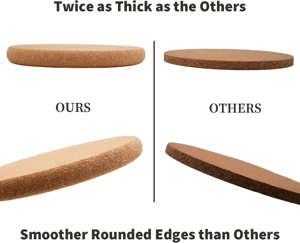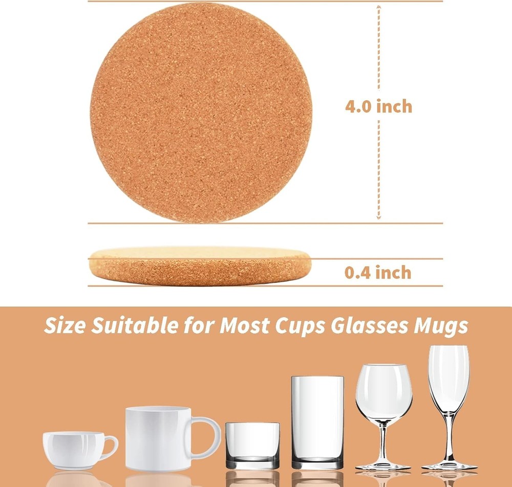 APPROPRIATE SIZE - All 6 cork coasters are 4 inches in diameter to fit most cups. The excellent thickness of 0.4 inches ensures that these absorbent coasters are sturdy and durable enough. These drink coasters provide years of protection for your furniture and tabletops to resist spills, heat, and condensation. PREMIUM MATERIAL - These cup coasters are made of 100% natural and environmentally friendly cork. Cork coasters are easy to clean, do not require special handling, and are ready for subsequent use with a simple rinse and air drying. In addition, the cork material prevents the coasters from sticking to the bottom of the cups when you lift them. MULTIPURPOSE USE - These wooden coasters' round shape and cork colors match most homes' interior style and the furniture's colors. These cork coasters can serve as holders for coffee cups in the office, as foils for glasses or drinks in the restaurant, embellishments for mugs or beer bottles in the home, and even as a cork trivet for the bottom of a hot pot in the kitchen. DRINK COMPANION - ToolMenu cork coasters feature a minimalist blank design, with a non-slip back for stable placement and lightweight for easy portability. It is a very practical drink companion with more thickness than most other coasters to protect your tabletops and furniture from stains, scratches, and noise more effectively and longer. PRACTICAL PRESENT - Our versatile coaster set is the perfect gift for friends and family. This practical gift is ideal for festivals, birthdays, weddings, and housewarmings. Our goal is to make these bulk coasters serve you as well as possible. Strive to ensure that you can fully enjoy your drinks, reduce unnecessary annoyance, and add convenience and fun.