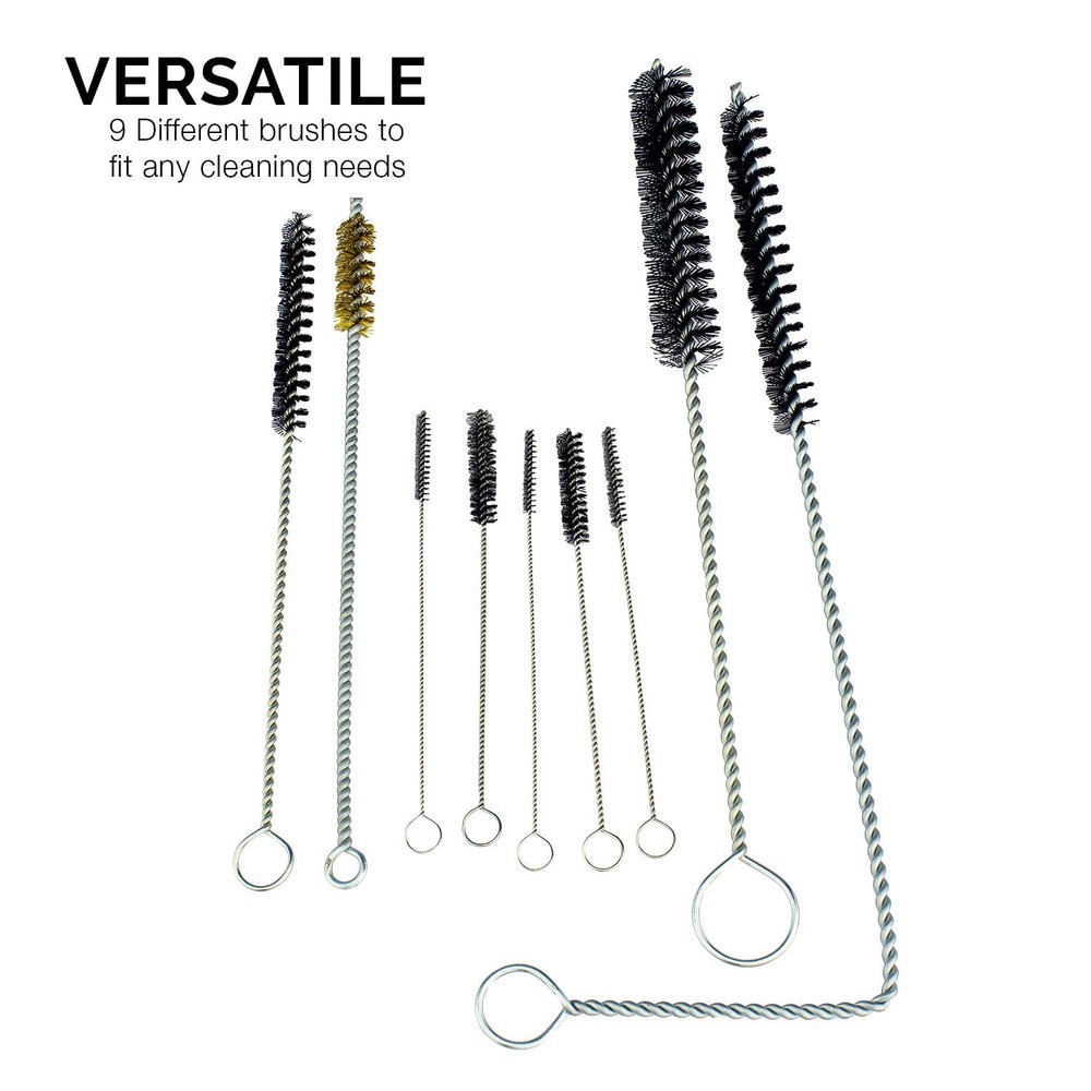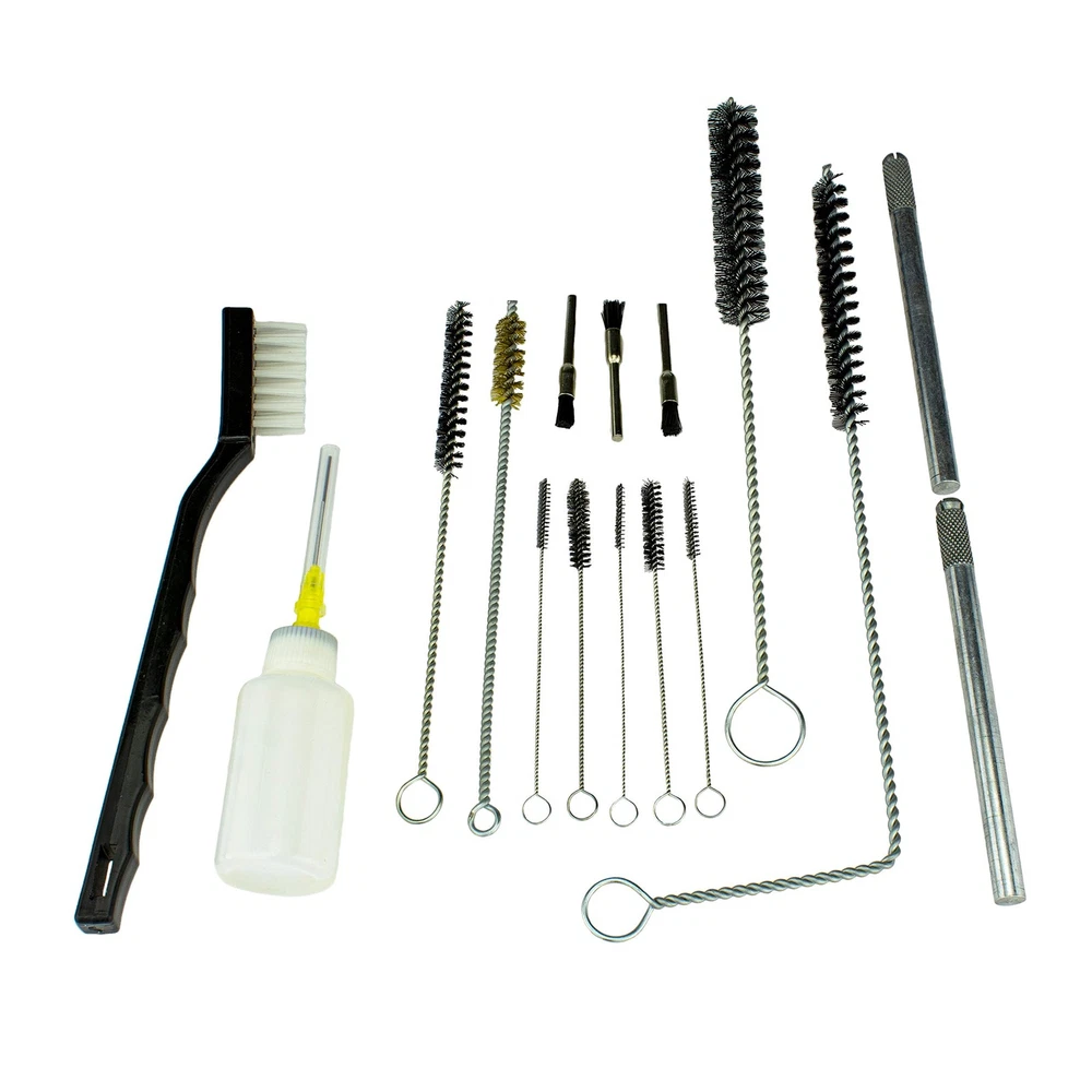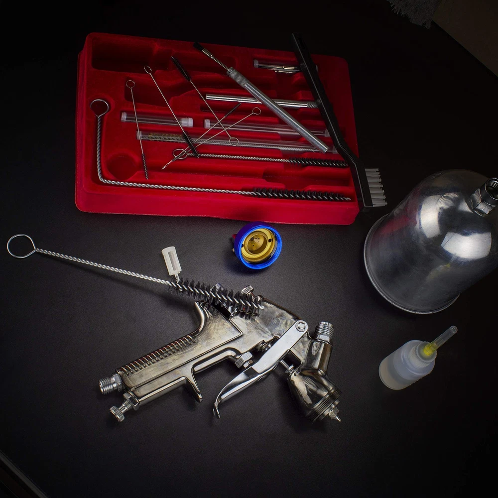 [COMPLETE]: Full set with 22 pieces for cleaning and maintenance of any spray paint to ensure excellent working condition. [EASY ACCESS]: Strong, flexible wire brushes allow for easy access to clean hard to reach cavities. [PROTECTION]: Multi-brush tools clean away any residue for better finishing results and extends life. [CONVENIENCE]: Maintenance supply equipment is placed in a compact compartmentalized tray for easy storage and visibility. [INCLUDES]: 4 pc. wire brush, 5 pc. flexible brush, 3 pc. mini brush, 1 pc. handle toothbrush, 6 pc. micro needles, 2 pc. aluminum holders, 1 pc. lubrication bottle, 1 pc. storage case.