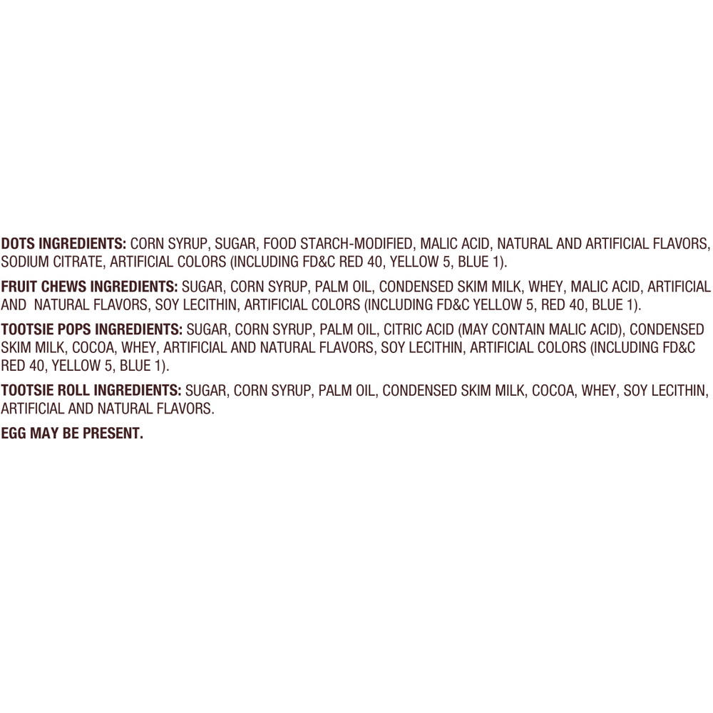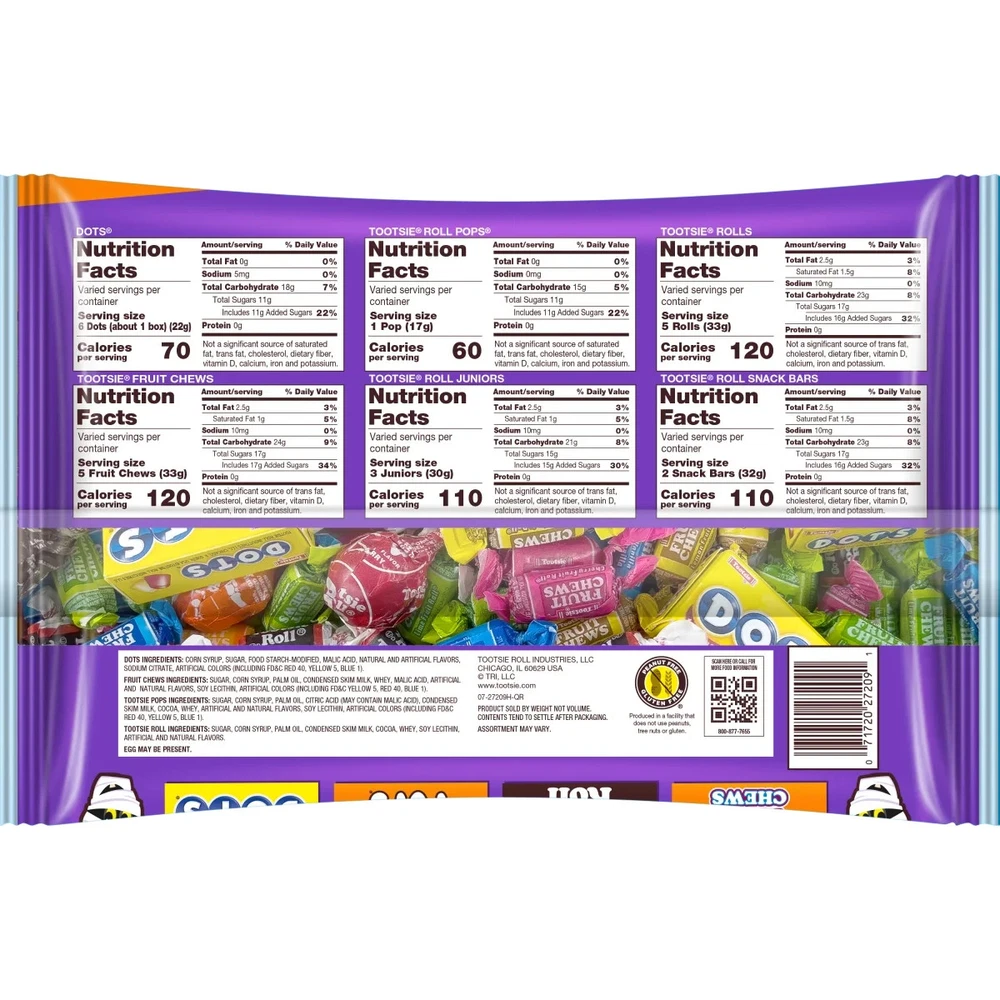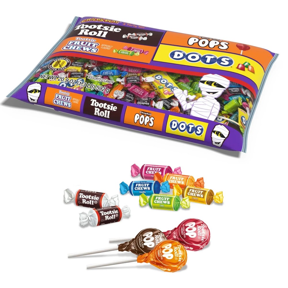Tootsie Child's Play, Assorted Halloween Candy, Individually Wrapped, 20.9 oz. Peanut Free and Gluten Free. Contains Milk FAST FREE SHIPPING IN USA FEATURES Tootsie Child's Play, Assorted Halloween Candy, Individually Wrapped, 20.9 oz. Peanut-Free, Gluten Free. Contains Milk. Child's Play mix offers some of the most popular Tootsie Roll candies - Chocolatey, Chewy Tootsie Rolls, Gummi Dots, Tootsie Pops lollipops with Tootsie Roll centers, and Tootsie Fruit Chews. Assortment of varying candy types and flavors with Tootsie Rolls, Tootsie Pops, Dots and Tootsie Fruit Chews Perfect combination to meet all your needs - trick-or-treating,