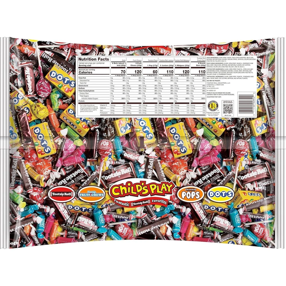 Child's Play Candy Favorites with Bonus Mobile Game, 5 Pounds of Individually Wrapped Party Candy - Fantastic Candy Variety Mix Bag - Peanut Free, Gluten Free (5 Pounds), Free & Fast Shipping. Nutrition facts 1.0 servings per container Serving size 1 Pop (17g) Amount per serving Calories 60 % Daily Value* Total Fat 0g Saturated Fat 0g Trans Fat 0g Cholesterol 0mg Sodium 0mg Total Carbohydrate 15g Dietary Fiber 0g Sugars 10g Protein 0g 0% Vitamin A 0% Vitamin C 0% Calcium 2% Iron *The % Daily Value (DV) tells you how much a nutrient in a serving of food contributes to a daily diet. 2,000 calories a day is used for general nutrition advice. Ingredients Tootsie Rolls: Sugar, Corn Syrup, Palm Oil, Condensed Skim Milk, Cocoa, Whey, Soy Lecithin, Artificial and Natural Flavors. Tootsie Pops: Sugar, Corn Syrup, Palm Oil, Citric Acid (May Contain Malic Acid), Condensed Skim Milk, Cocoa, Whey, Artificial & Natural Flavors, Soy Lecithin, Artificial Colors (Including FD&C Red 40, Yellow 5, Blue 1), Strawberry Powder. DOTS: Corn Syrup, Sugar, Food Starch-Modified, Malic Acid, Natural And Artificial Flavors, Sodium Citrate, Artificial Colors (Including FD&C Red 40, Yellow 5, Blue 1). Tootsie Fruit Chews: Sugar, Corn Syrup, Palm Oil, Condensed Skim Milk, Whey, Malic Acid, Artificial and Natural Flavors, Soy Lecithin, Artificial colors (Including FD&C Yellow 5, Red 40, Blue 1). About this item Brand Tootsie Roll Flavor Variety Item Form Candy Unit Count 80.0 Ounce Number of Items 1 CHOCOLATE AND FRUITY FLAVOR MIXED ASSORTMENT: Includes Tootsie Rolls, Tootsie Pops, Dots, Tootsie fruit chews and Tootsie snack bars! CANDY VARIETY FOR SPECIAL EVENTS: Perfect for kids' Parties, piñatas, picnics, classroom outings. GREAT VALUE 5 POUND BAG: Combining the most popular Tootsie Roll candies in one share-friendly bag, there's something for everyone in this variety bag of kids' Favorite candies. CLASSIC FLAVORS YOU KNOW AND LOVE: The classic, value-packed candy assortment, Child's Play is the ultimate fun-size Halloween candy bag! Peanut free, Gluten Free, and Kosher. BONUS MOBILE GAME IN IMAGE GALLERY: Scan the QR code in the image gallery for a bonus mobile game, packaging does not include QR code Product Description Everyone's favorite Candy is always on-hand with child's play, The world's #1-selling kid's candy Variety bag. Combining the most popular Tootsie Roll Candies in one Share-Friendly bag, Child's play's generous assortment of Tootsie Rolls, Tootsie pops, dots, Tootsie fruit Chews and Tootsie snack bars is the ultimate, value-packed candy assortment. Great for kids' Parties, classroom outings, picnics, and most of all, Halloween!!! Product Note: Exposure to heat or sunlight may lead to melting/damage of product. Hence customers are expected to be available during the product delivery.