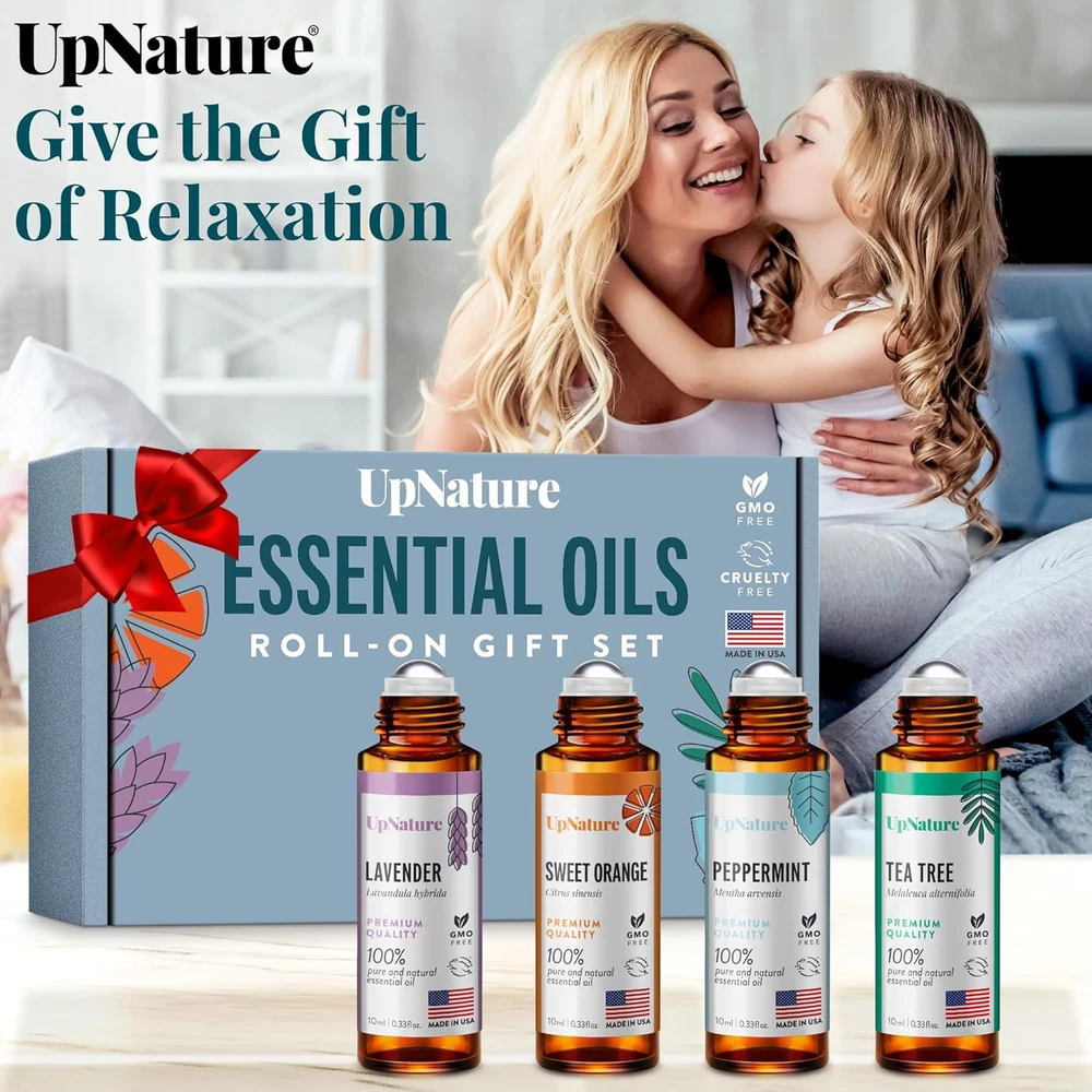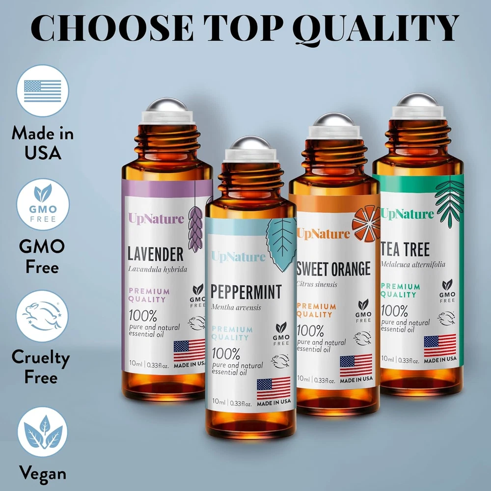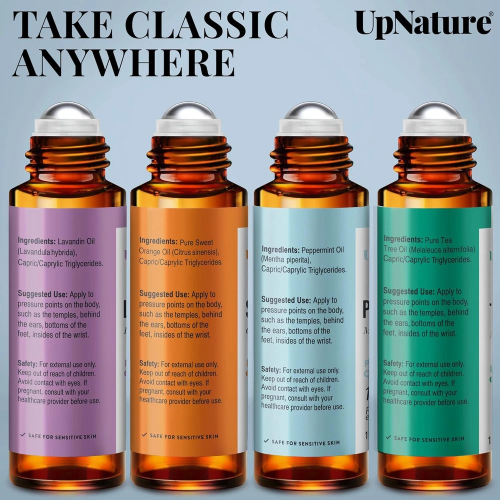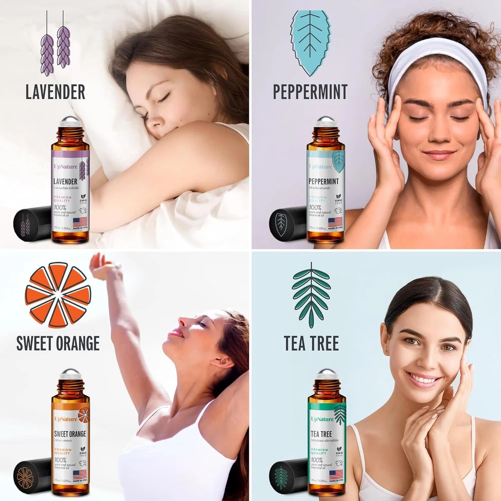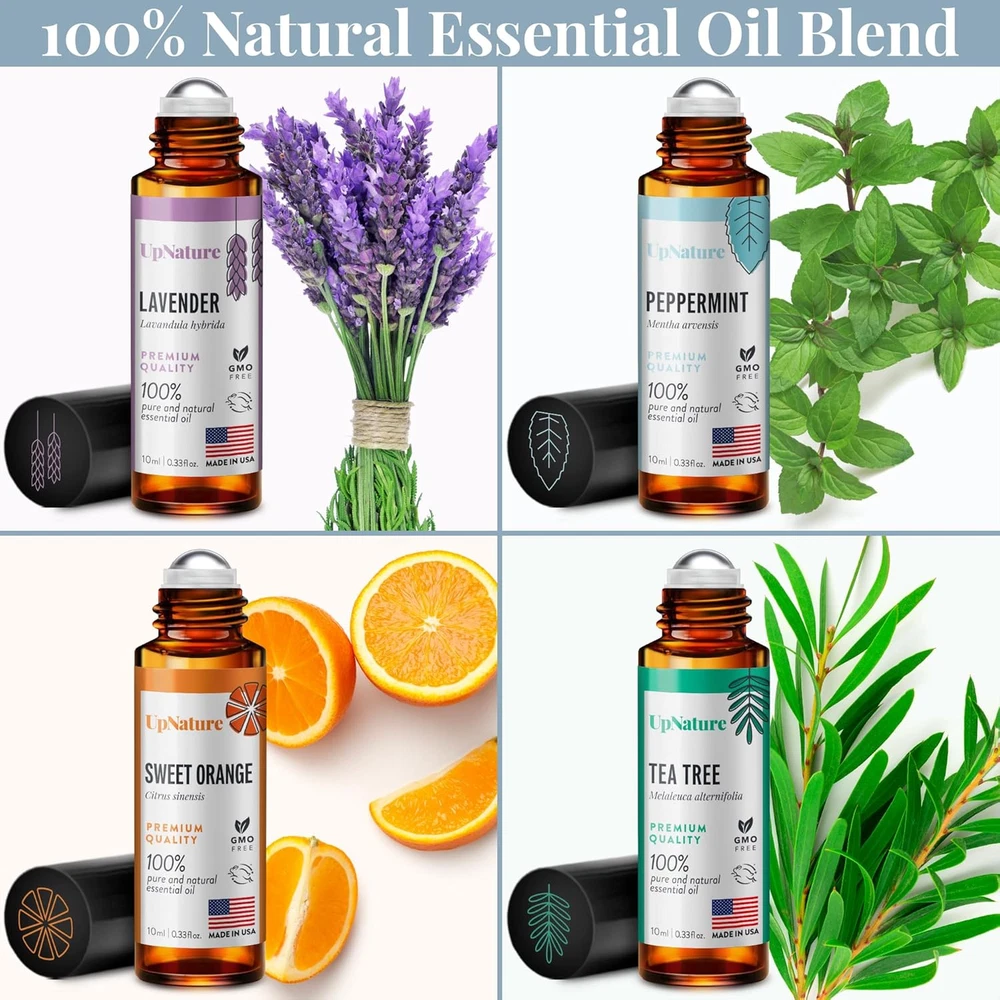 HIGH QUALITY ESSENTIAL OIL ROLLER SET: Set of the classics: Lavender, Peppermint, Sweet Orange and Tea Tree rollerball essential oils. 100% pure, gentle, and effective non-GMO natural essential oil. No toxins, additives. Blended with Carrier Oils. Steam distilled. Packaged & bottled in the USA. YOUR ESSENTIAL OIL STARTER KIT: Lavender, Peppermint, Sweet Orange and Tea Tree will get you started on your essential oil journey. GET RELAXED: Pair Lavender and Sweet Orange essential oils to create a calming atmosphere and help you relax your mind and body. HEAD COMFORT: Pair Peppermint and Tea Tree essential oils to help ease head discomfort and support a clear mind. SAFETY PRECAUTION: For external use only. We recommend that you patch test the oils for topical use. Apply to clean skin on the inside of your elbow or wrist. Cover with a bandage and leave for 24 hours. If a rash or redness appears, discontinue use of product. Product Ingredients: Lavandin oil, orange oil, peppermint oil, tea tree oil. Product Description
