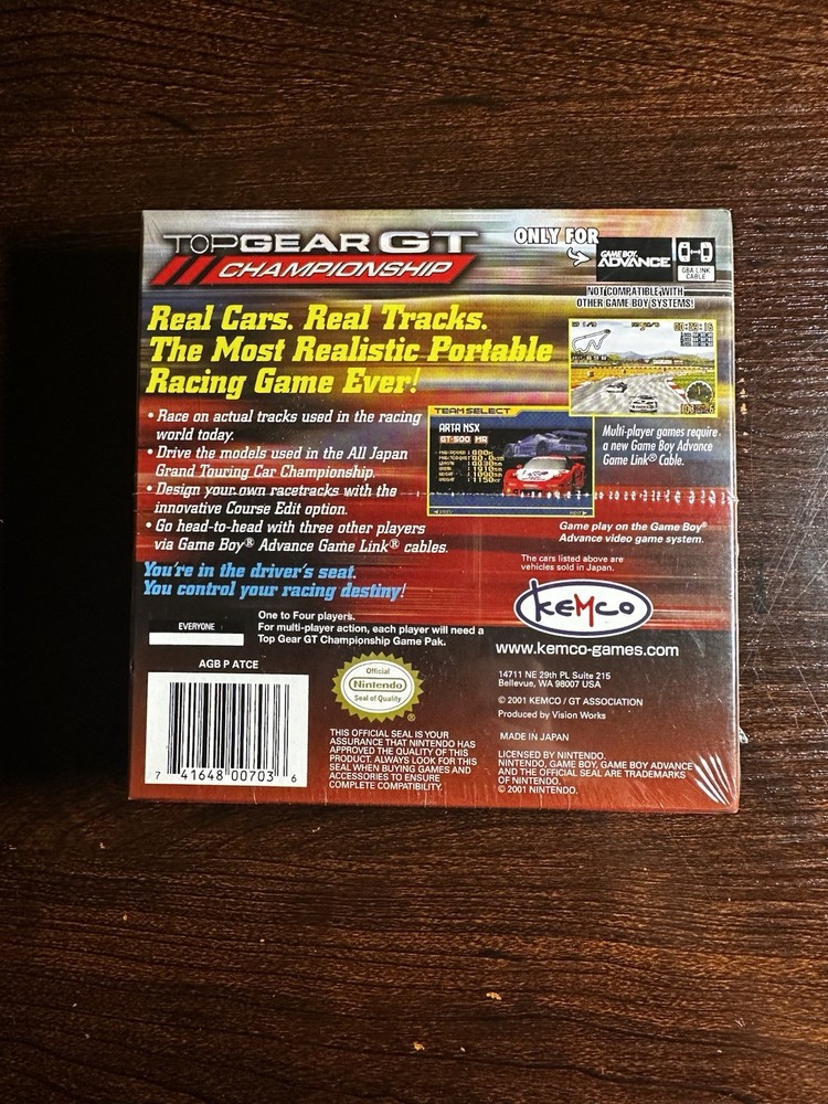 Platform:Nintendo Game Boy AdvanceRating:E-EveryoneSub-Genre:Car RacingFeatures:Manual Included, MultiplayerRelease Year:2001Country of Origin:JapanGame Name:Top Gear GT ChampionshipMPN:AGB P ATCEVideo Game Series:Top GearRegion Code:NTSC-U/C (US/Canada)Publisher:KemcoGenre:Racing