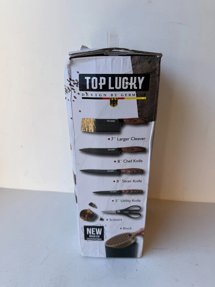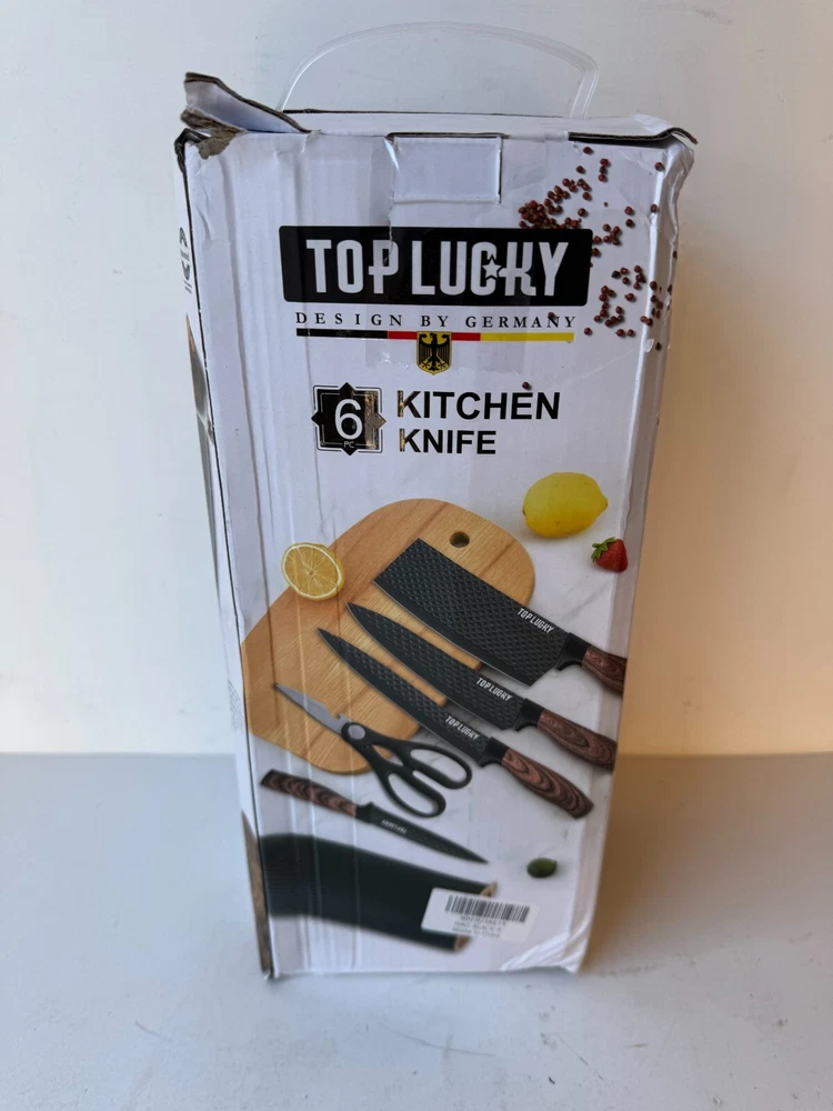 Top Lucky 6-Pcs Kitchen Knife Set Stainless Steel Blade Rust Resistant Non-Stick Description Top Lucky 6-Pcs Kitchen Knife Set Stainless Steel Blade Rust Resistant Non-Stick Product Detail • Brand : Top Lucky • Blade Material : Stainless Steel • Blade Color : Black • Type: Knife Set Please message me if you have any questions.