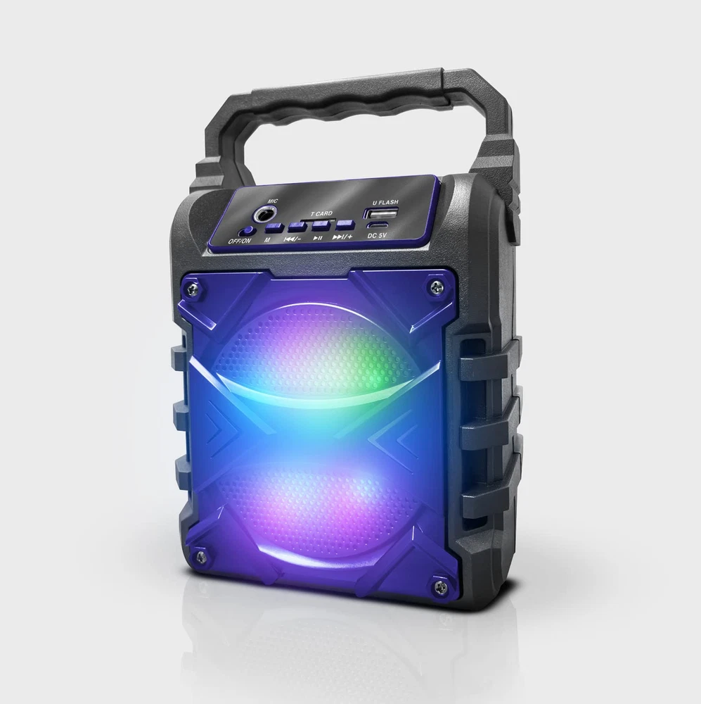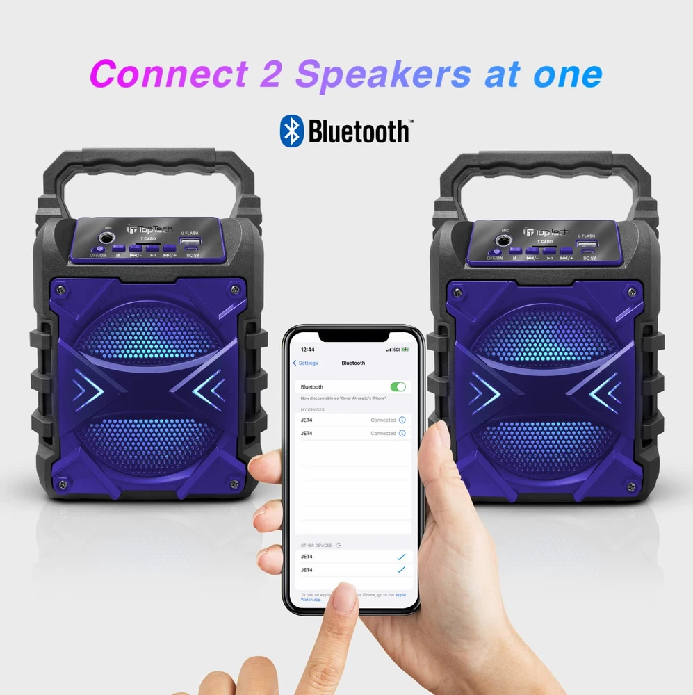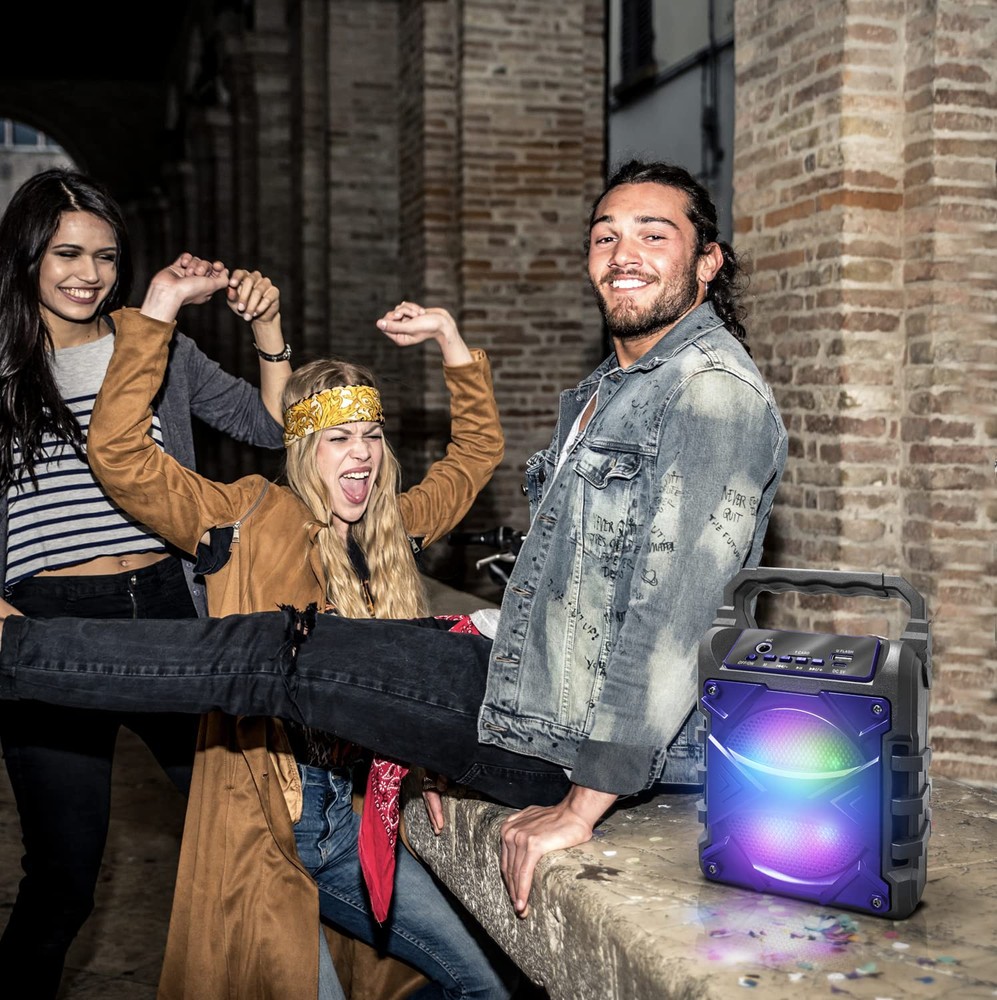 SEAMLESS CONNECTIVITY OPTIONS: Enjoy flexible connection options with the Jet-4 Bluetooth Portable Speaker, featuring built-in Bluetooth for wireless pairing with smartphones and , and a 3.5mm AUX jack for non-Bluetooth devices like MP3 players. Also supports TF/USB input for enhanced versatility. ENHANCED KARAOKE MODE: Turn any gathering into a karaoke party with the Jet-4’s Karaoke Mode. Activate colorful lights for a nightclub atmosphere, and toggle between accompaniment and voice modes effortlessly with a single button. Wired mic compatibility adds extra fun. SIMPLE MULTI-FUNCTION CONTROL: The intuitive single console allows you to adjust sound effects, microphone settings, and mode switching with ease. Tailor your listening or singing experience on the fly with direct, user-friendly controls. TRUE WIRELESS STEREO (TWS) FUNCTIONALITY: Maximize your audio output with TWS technology—pair Jet-4 speakers for an immersive stereo experience. Connect both speakers to your device seamlessly for double the sound power and dynamic clarity. 6 HOURS OF PARTY POWER: Equipped with a rechargeable DC 5V battery, the Jet-4 provides up to 6 hours of non-stop music, karaoke, or entertainment. Perfect for parties, outdoor adventures, and casual hangouts without worrying about overcharging.