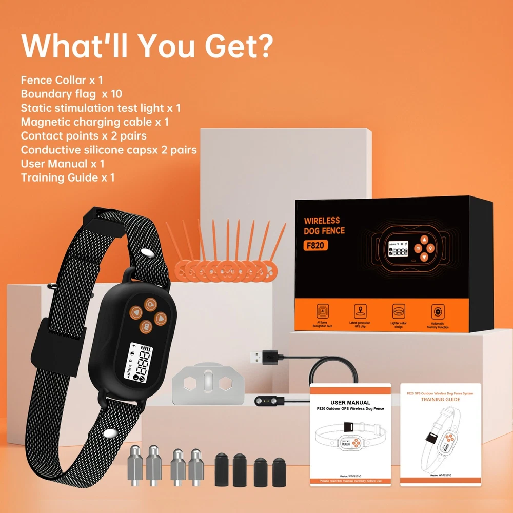 Model F820 improves upon the best-selling F800 model in critical ways: Latest generation GPS computer chip: Offers a stable GPS connection no matter how complex the environment with the ability to connect to multiple satellites at once, ensuring a stable connection whether you are in a dense urban setting or multi-acre property with mixed terrain (i.e. mountains close-by, trees, neighbours, etc). We tested this recently when a buyer based on a 5-acre property in Burpengary, north of Brisbane struggled to maintain a stable connection with the original F800 model but has had no issues at all with the new F820! Shorter Radius for More Domestic Uses: The minimum radius of the new F820 can be set as low as 23-metres from set point whilst the F800 original's minimum is 33-metres. This means more dog owners in smaller properties can benefit from wireless GPS dog fence technology than ever before! 40% Lighter than the Original: The new F820 is only a total of 98g combining collar and belt whilst the original F800 is 158g. This offer more versatility for fitting on small to medium dogs and less strain on your dog's neck overtime. Multiple Software Upgrades: F820 features the latest software upgrade with intelligent scene recognition, weak signal compensation, anti-interference and enhanced automatic dog protection mode. HOW IT WORKS Set up the central starting point for the e-collar and distance to the boundary. Minimum radius is 25 yards (approx 22m) and maximum radius is 999yards (approx 913metres). Install boundary flags a safe distance from the boundary limit. This is where you want the collar to warn your dog about progressing further before static or vibration correction. Choose whether you prefer to use vibration or static correction modes and if you want the collar to automatically increase the intensity level or fix it yourself at a specific level. Spend time training your dog to recognise the boundary flags and what to do when they hear the warning (training guide supplied). PRODUCT HIGHLIGHTS New lightweight design with latest generation GPS chip for best-ever stability in complex environments. New software upgrades for more effective boundary training, enhanced dog protection and more efficient power usage. Create a circular boundary around your property with radius distance from 25-metres (25 yards) to over 900-metres (999 yards). Flexible training with the choice of using vibration or static correction with five levels of automatic correction sequence. Intuitive boundary training correction automatically increases in intensity from levels 1 to 5, depending on the dog's behaviour. IPX7 completely waterproof e-collar allows your dog to take short swims or stay outside in any weather. Large 700mAh rechargeable Li-ion battery plus enhanced signal stability provides power to the collar for up to two weeks on a single charge. (Note: It is advised to limit your dog wearing the collar to no more than 12 hours per day.) Collars will not interfere with each other if you need to contain more than one dog. PACKAGE INCLUSIONS 1 x Boundary Fence E-collar 2 pairs metal contact points (short and long) with conductive silicone covers Magnetic suction USB charging cable 10pcs yellow flags for boundary training 1x Test Bulb 1x Operating Guide 1x Training Manual. COLLAR SIZING Collar receiver size dimensions: 7cm across x 4cm tall x 3cm thick Belt size range: 23cm to 66cm neck circumference Total weight (collar and belt): 98g Ideal for dogs weighing between 6kg to 60kg.