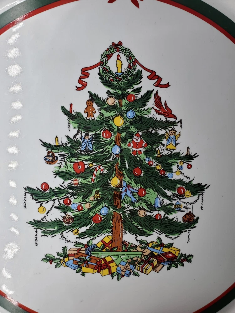 Add a festive touch to your holiday table with this 11" Stoneware Platter from Topco. The Ribbons & Tree Christmas Tree pattern is a festive addition to your holiday decor. Use this platter as a Cake Plate too. The contemporary style and multicolor design make it a perfect addition to your Christmas décor. The platter is made of durable stoneware material and features a Christmas tree theme, making it an ideal choice for the occasion. This Topco Ribbons platter is 11 inches wide and weighs 1 pound and 5.8 ounces. It is recommended to hand wash the platter to ensure long-lasting use. Use it to serve your favorite holiday dishes or as a decorative piece in your home. There are no chips or cracks.