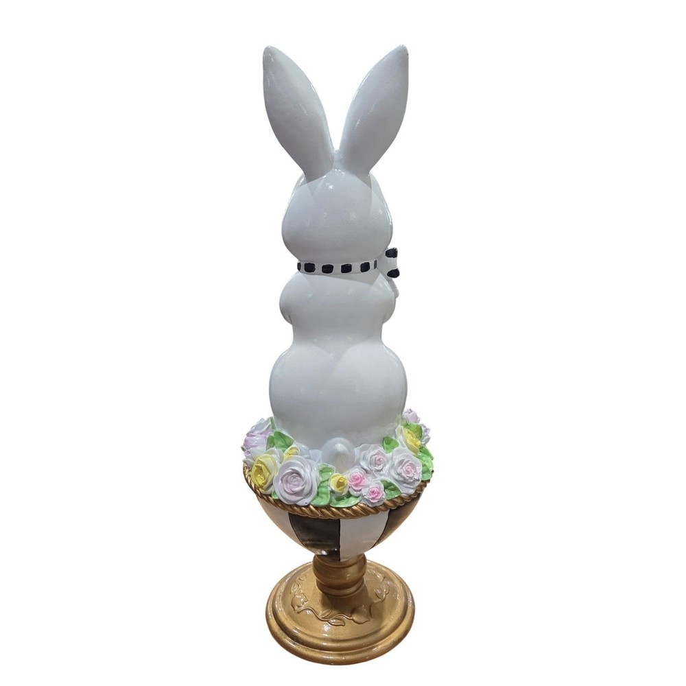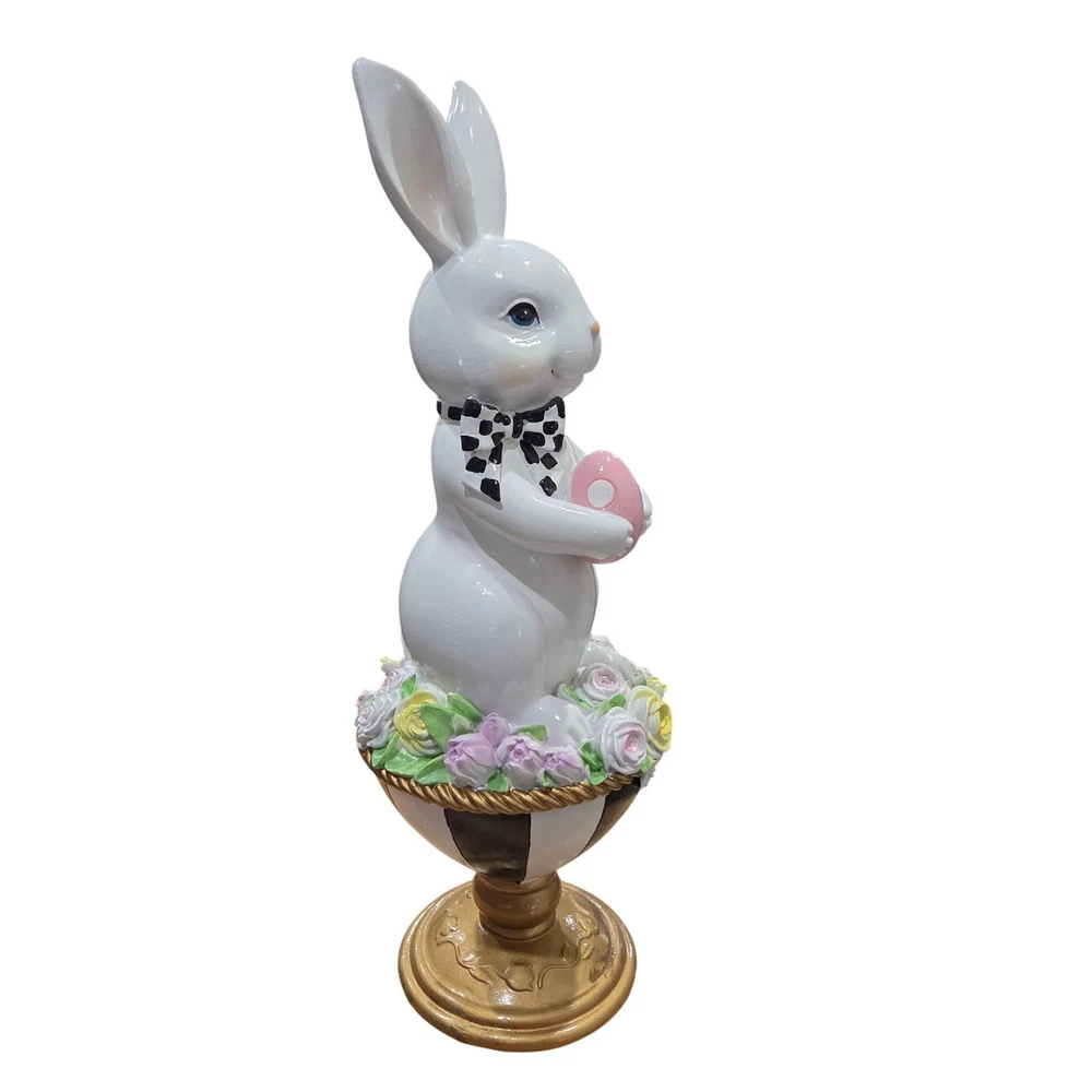 Easter bunny figurine stands elegantly on a black and white striped pedestal base, accented with a gold-tone finish. This charming white rabbit wears a whimsical black and white polka dot bow and holds a delicate pink speckled egg. A lush ring of pastel roses in shades of pink, yellow, and lavender circles the base of the bunny, adding a touch of spring garden beauty. Perfect for a mantel display, tabletop centerpiece, or as a festive addition to any holiday decor collection. Keywords: Easter Decor, Spring Figurine, White Rabbit, Mackenzie Childs Style, Harlequin, Polka Dot Bow, Floral Base, Pastel Roses, Holiday Centerpiece, Whimsical Decor, Seasonal Accents, Collectible Bunny, Tabletop Decoration, Grandmillennial Aesthetic