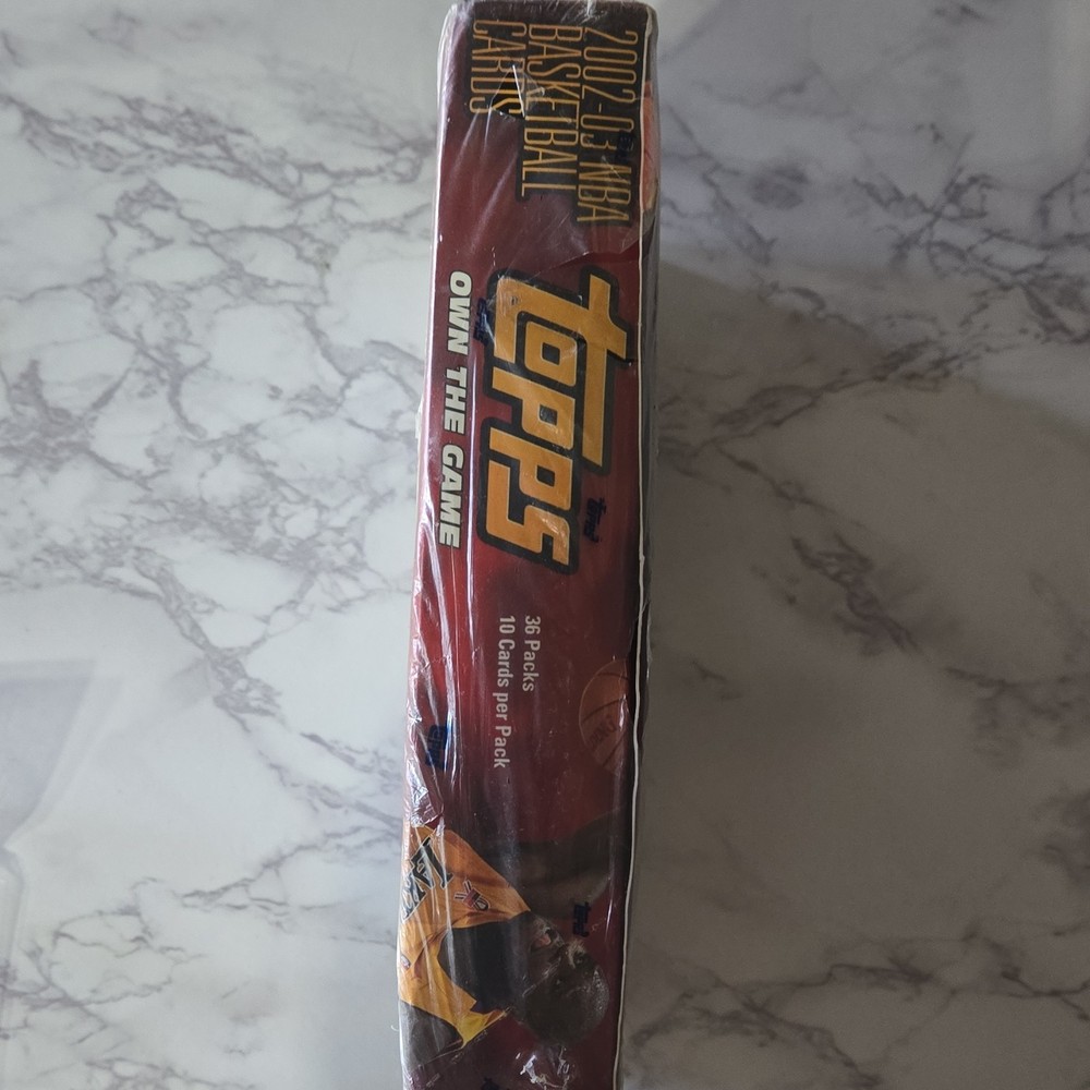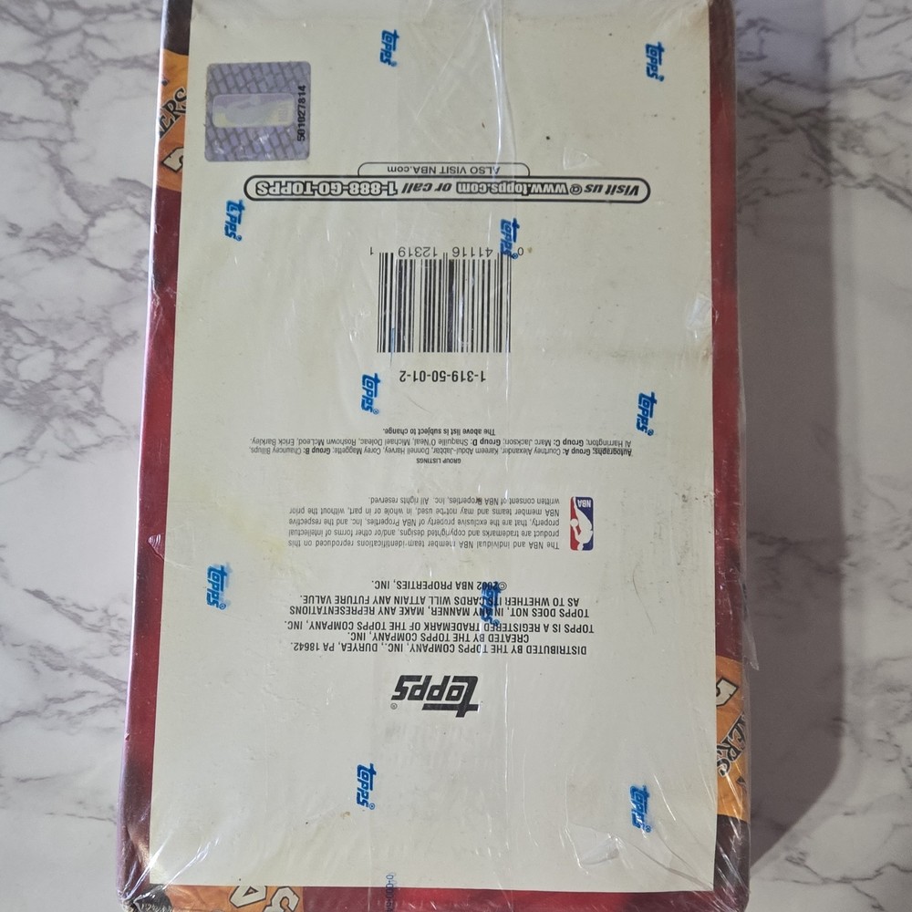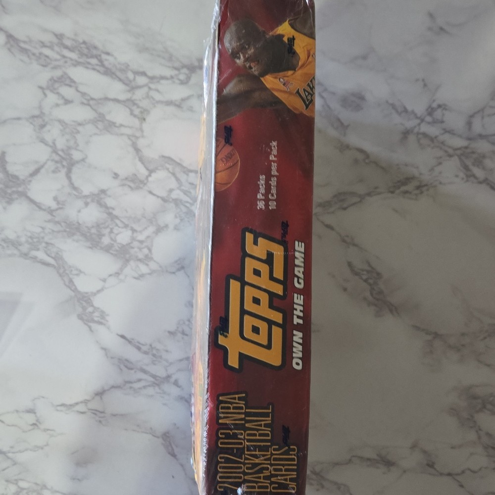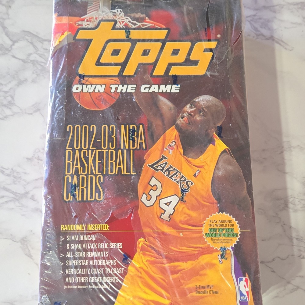 Manufacturer:ToppsMPN:1-319-50-01-2Number of Cards:360Type:Sports Trading CardSeason:2002-03Card Size:StandardMaterial:Card StockLanguage:EnglishSet:2002-03 ToppsPlayer/Athlete:Shaquille O'NealSport:BasketballConfiguration:BoxCountry of Origin:United StatesFeatures:Superstar Autographs, Slam Duncan, Shaq Attack Relic Series, All-Star Remnants, Vertically Coast to CoastYear Manufactured:2002Team:Los Angeles LakersNumber of Boxes:1League:National Basketball Association (NBA)