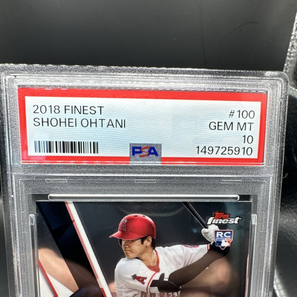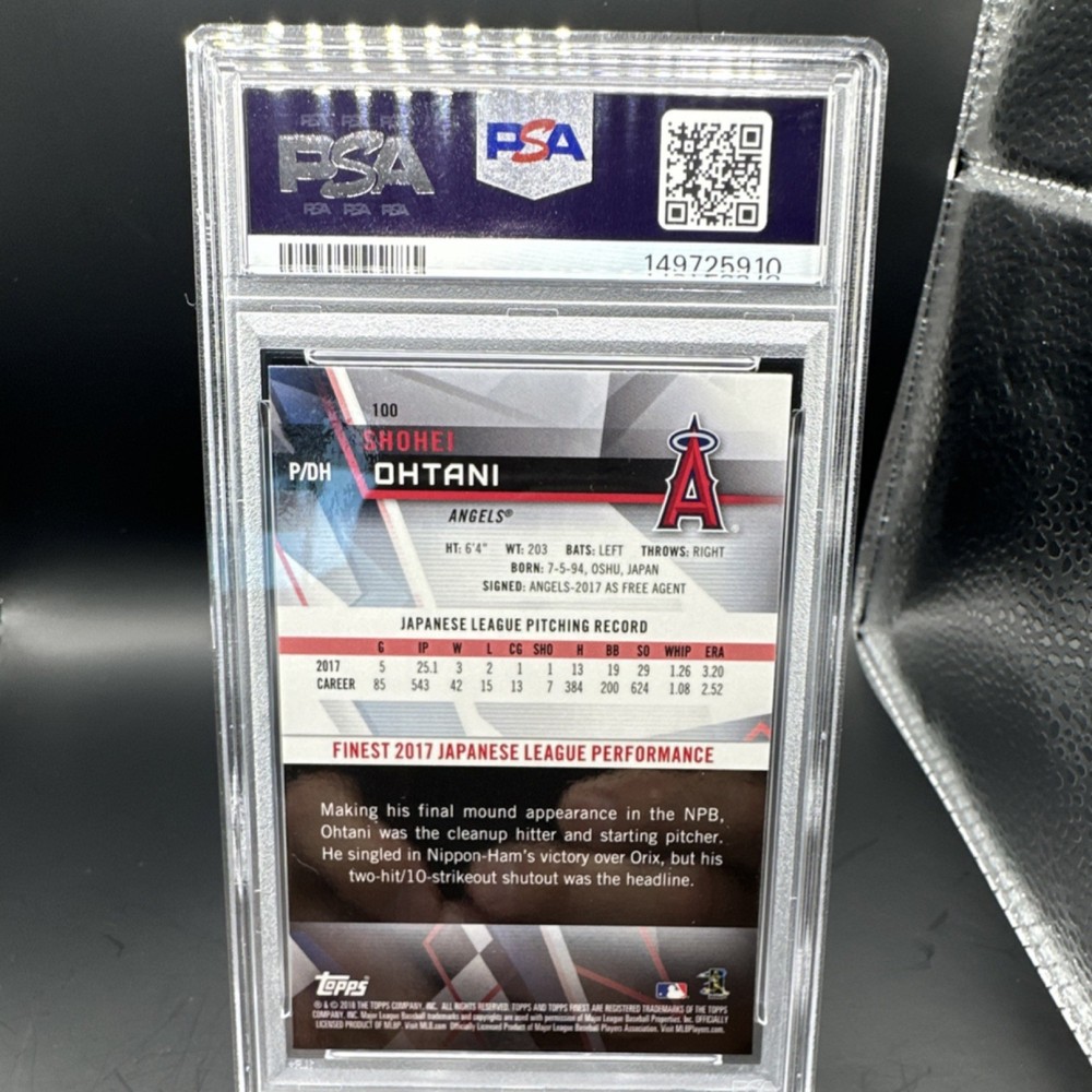 SLAB IS PERFECT!!!! JUST BACK FROM PSA!!! ZERO SCRATCHES ON SLAB!!! The product is a Topps 2018 Finest Shohei Ohtani #100 Rookie Base trading card graded as a PSA 10. This baseball card features the talented player Shohei Ohtani from the Los Angeles Angels in Major League Baseball. The card is made of card stock and is an original licensed reprint from Topps. It is part of the 2018 Topps Finest set and has received a high grade of 10 from Professional Sports Authenticator (PSA). This collectible item is a valuable addition to any sports trading card collection