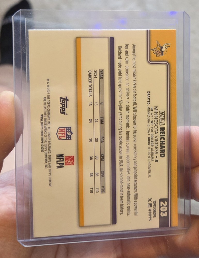 Topps 2025 Chrome Will Reichard Gold #203 Minnesota Vikings Football